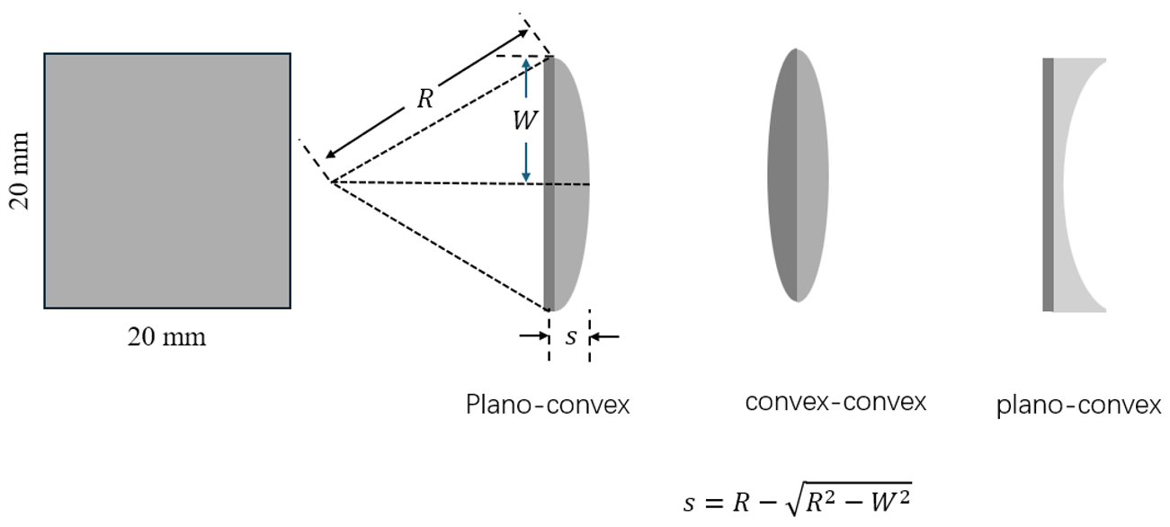 如图2所示,根据柱面镜表面的类型可以将它分为平凹柱面镜、平凸柱面镜和双凸柱面镜。单个平凸柱透镜由一个矩形平面和一个圆柱面构成,前表面分别称为母线和弧线,根据焦距公式R=f(n-1), f为镜头焦距,n为折射率,R为曲率半径,矢高公式为  ,W为半弧线宽。这里设置宽度和长度都为20mm,材料为BK7,焦距为100mm,对应的曲率半径为51.68 mm。可以利用常用的软件生成镜头文件,也可以用VirtualLab Fusion中的Lens Sytem表面编辑的功能进行编辑。