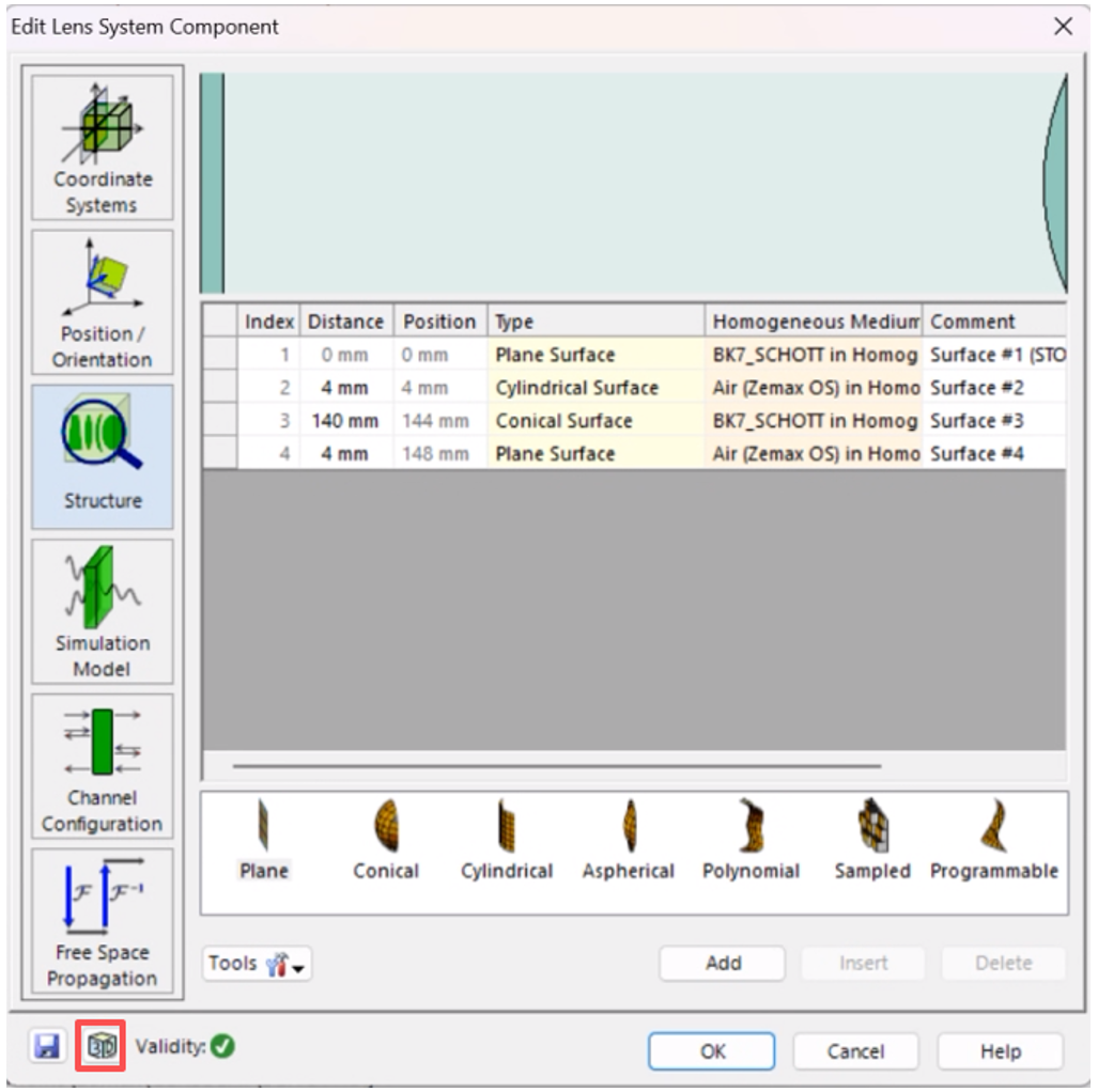 如图4,点击编辑表面,可以把对应的Elliptical改成Rectangular,表示从(椭)圆形变为矩形。设置完成之后可以将标签改为CL1,选中CL1,复制、粘贴,将其命名为CL2,然后将其翻转(选中之后点击Turn Component)。这么做是为了让两个凸面相对,据说可以减小像差。在VirtualLab Fusion中也可以自行定义镜头,在光路编辑器中从Components->Multiple Surfaces-> Lens system 添加透镜系统,然后点击Add按钮添加平面和圆柱面。