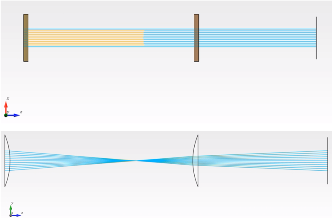 利用光线追迹引擎可以对柱透镜组进行光线追迹分析,从图7可以看到在一个面上没有聚焦效果,在两一个面则具有聚焦效果。