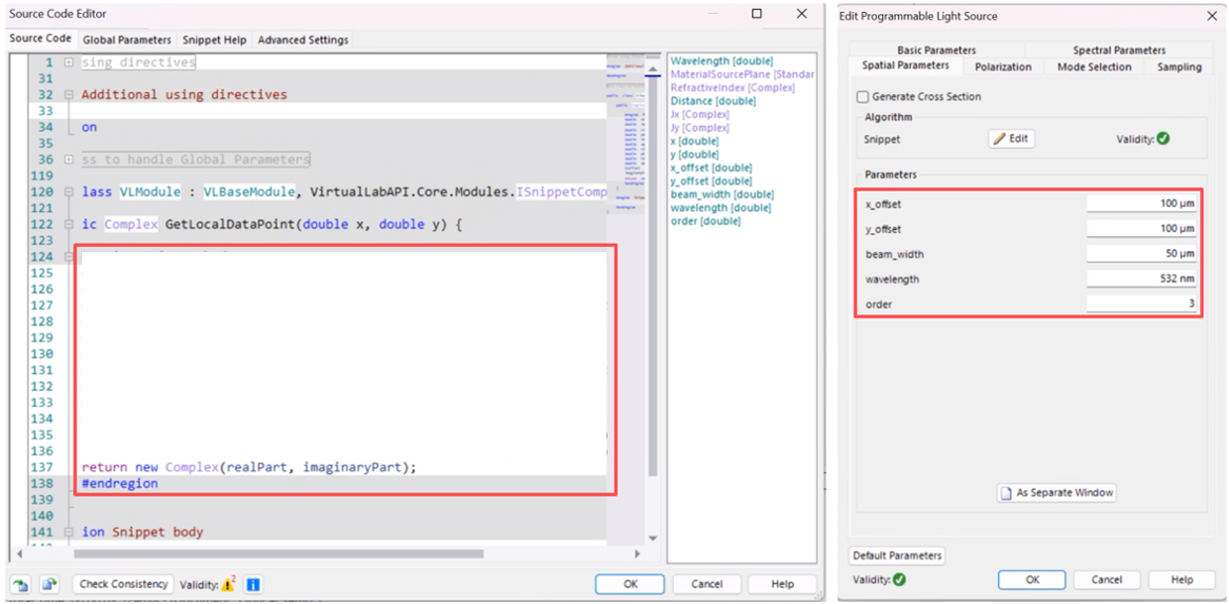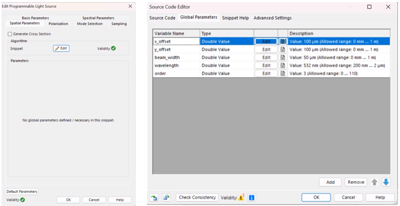 在光路编辑器中可以添加可编程光源,通过C#代码定义光源,以下将通过一个简单案例说明如何用可编程光源自定义你所需要的光源。打开Programmable Light Source编辑器,我们看到在Parameters中式空白的,点击Edit按钮打开编辑窗口。在global parameters中用Add按钮依次添加x_offset、y_offset、beam_width、wavelength和order几个参数,设置其默认值和范围。