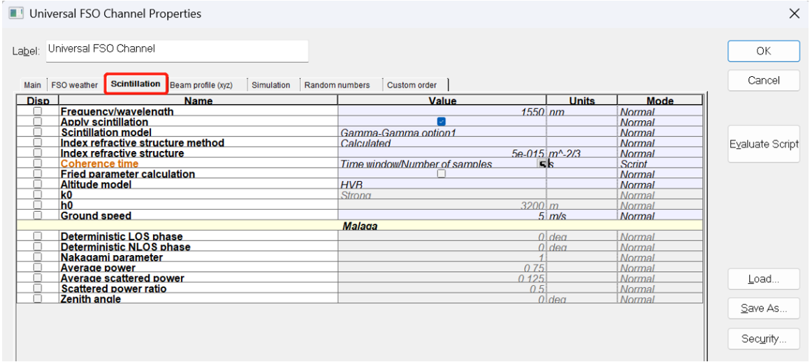 FSO信道采用Universal FSO Channel组件,它允许定义弱、中等和强湍流的各种闪烁模型。在组件的Scintillation选项卡下,按图2所示设置。