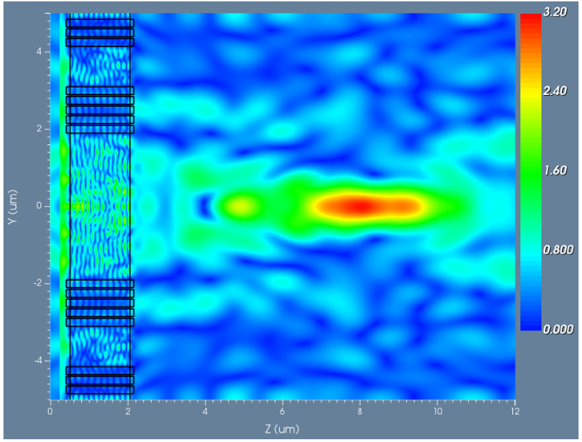 将透镜设计改为超透镜后,得到了相似的结果。其焦点峰值位于 8.0475μm 处,但光斑尺寸更大。两种设计结果的差异源于超构透镜中高透过率区的折射率对比度不同且透射率较低。