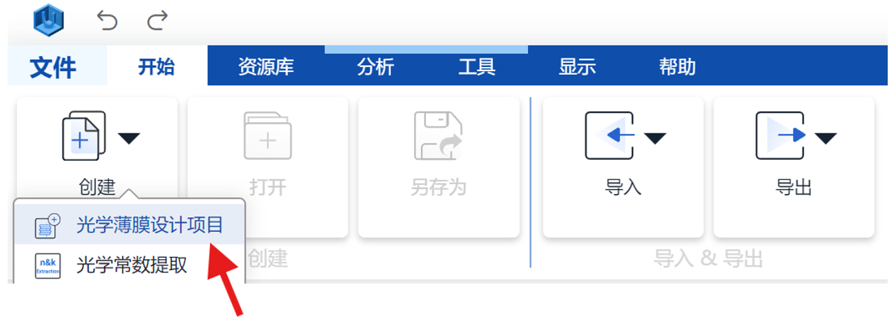 1、在开始选项卡中,用户可以创建一个光学薄膜设计项目。