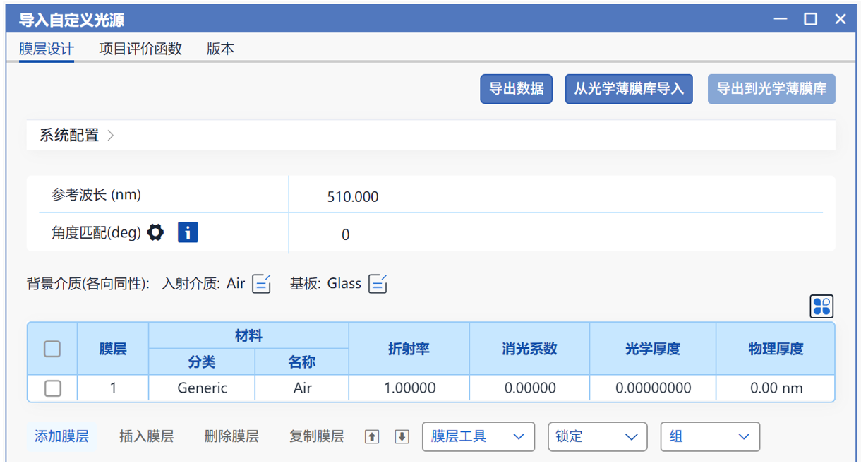 3、创建的新项目中默认采用波长为510nm的光源,默认的薄膜也只有一层,用户可以在此窗口中定义所需的光源和膜系结构。