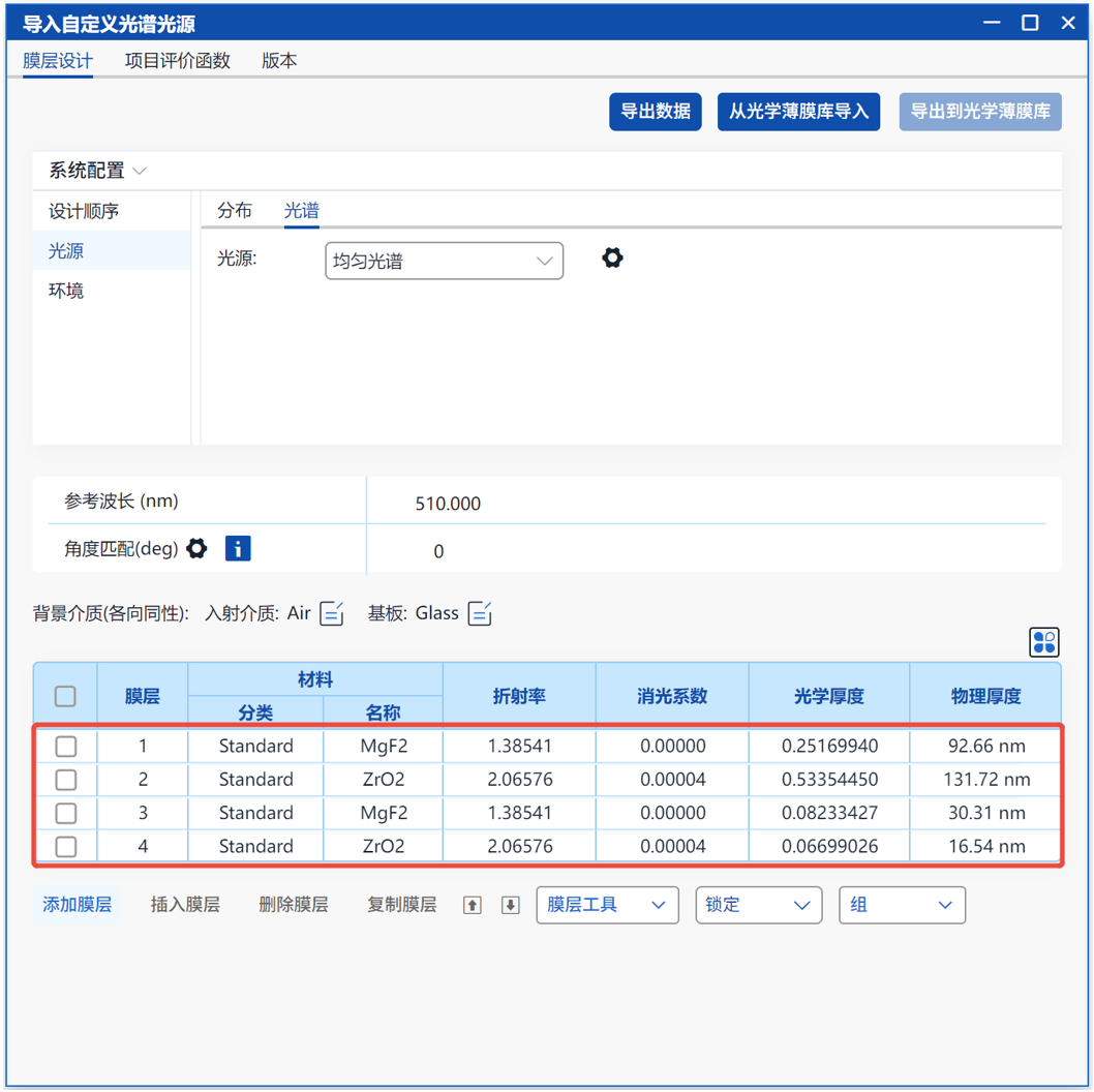1、点击“从光学薄膜库导入”,就可以从薄膜库中导入所需薄膜。