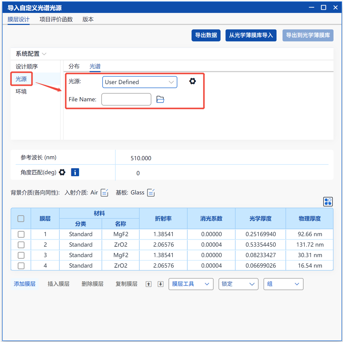1、在膜层设计的系统配置下,将光源设置为通过导入光谱数据来自定义光源,可在上图所示位置加载光谱数据。