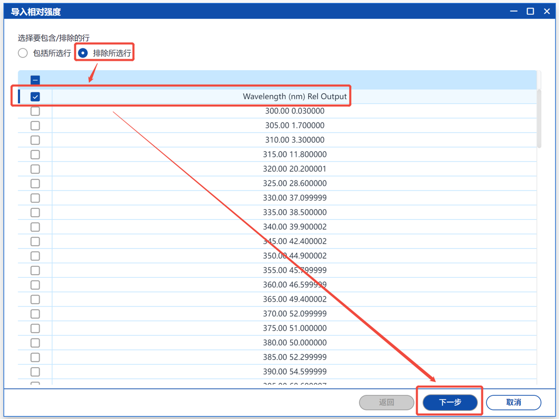 2、在导入光谱数据文件后,将Rel Output这一行排除,并点击下一步。