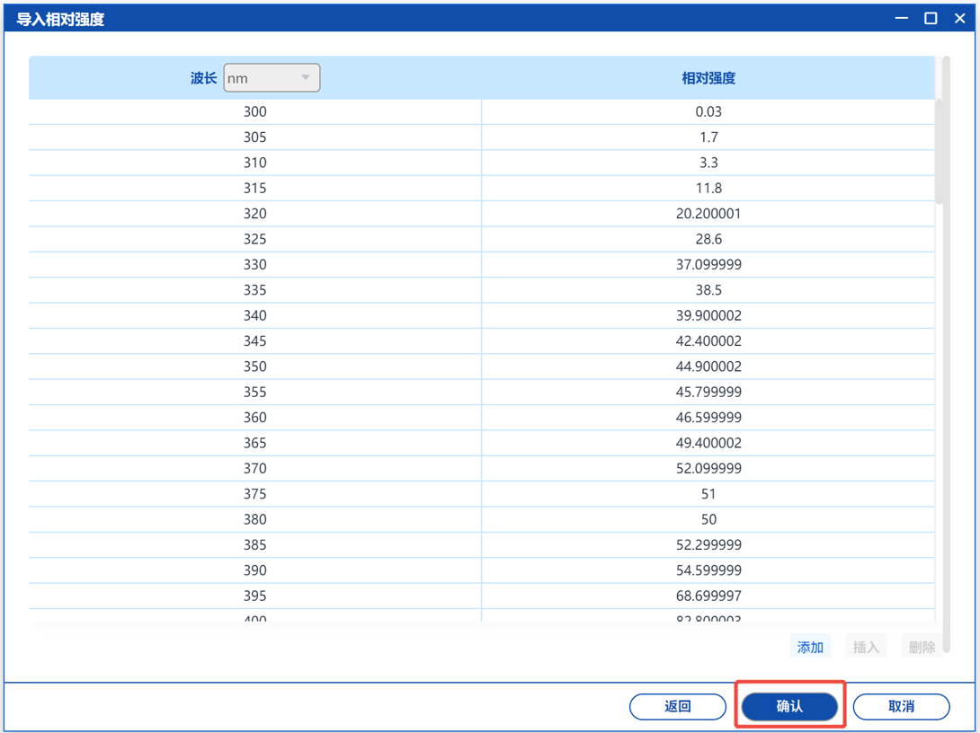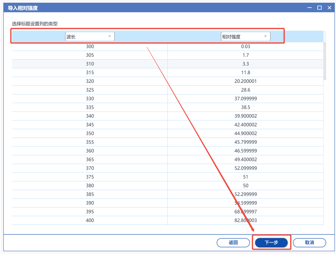 4、在选择标题设置列的类型时,第一列设置为波长,第二列设置为相对强度,并点击下一步。