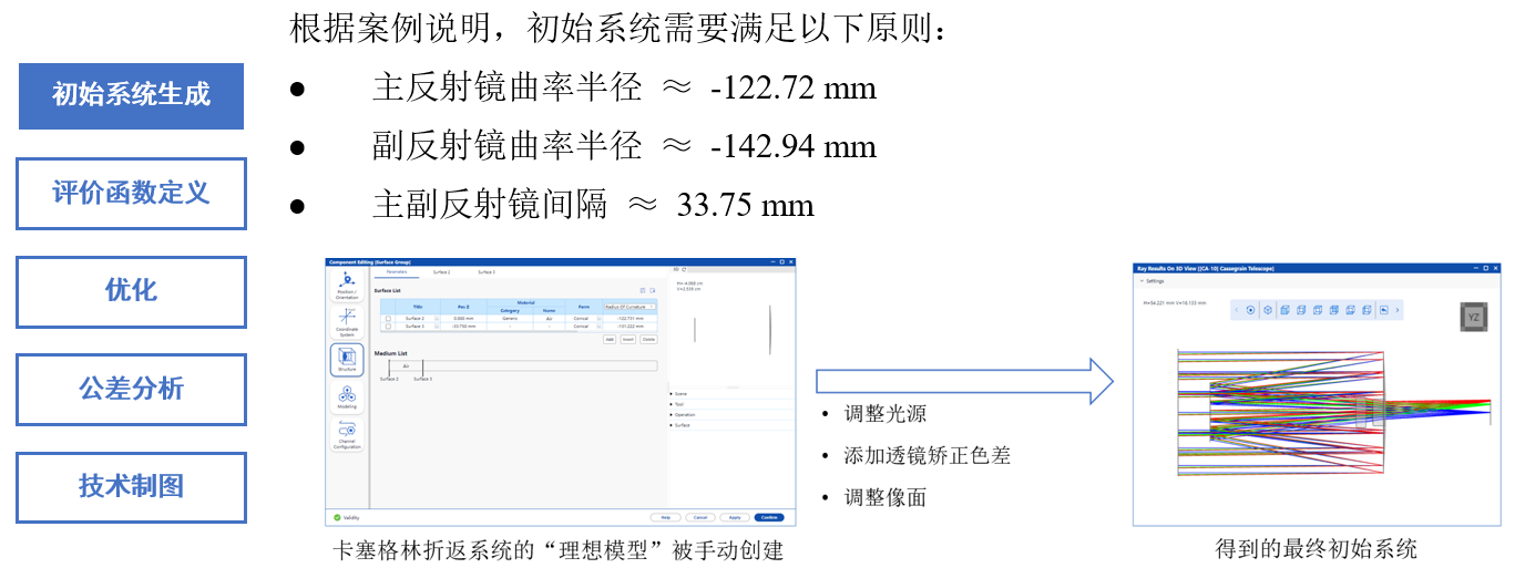 卡塞格林望望远镜广泛应用于天文观测,卡塞格林望远镜广泛应用于天文观测、空间成像和激光测距等领域,凭借其折叠光路设计,实现了长焦距与紧凑结构的结合,具有口径大、像差校正能力强和易于安装探测器等优点。在本案例中,将通过设计一个典型的折返式卡塞格林望远镜光学系统,演示在 VLU 中的光学设计流程,包括初始结构建立、像差分析、评价函数定义、优化。