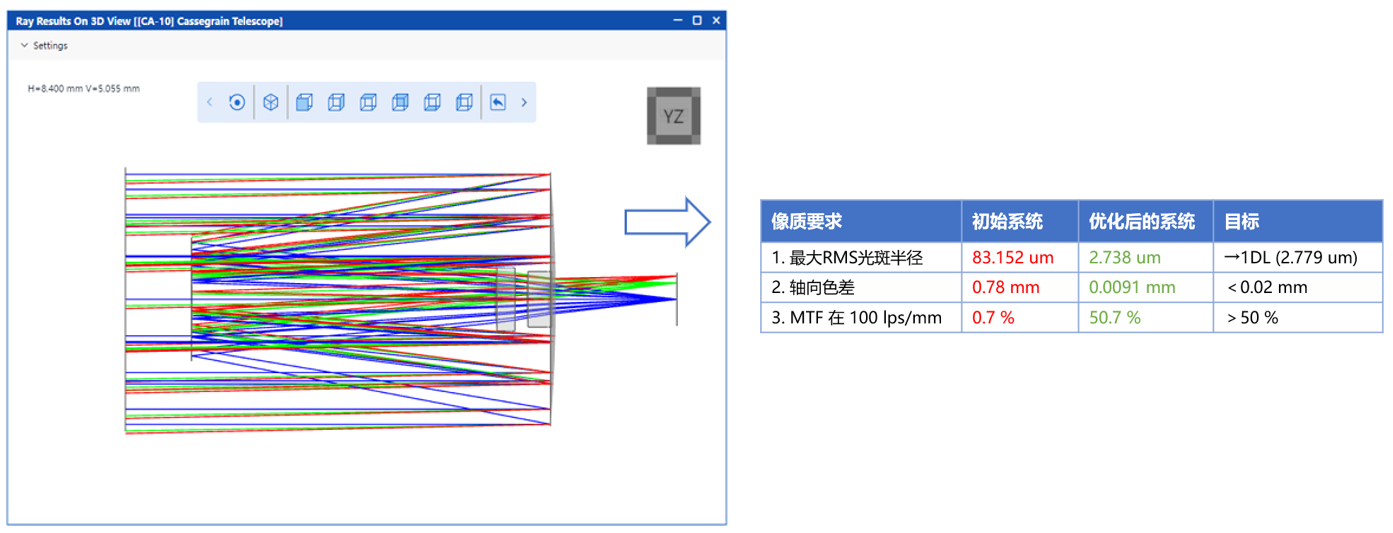 通过采用POWELL算法进行优化后,满足了像质要求 1-3,系统规格 2-3、额外系统限制1-2以及加工要求 1,此外系统规格1在生成初始系统时已满足。