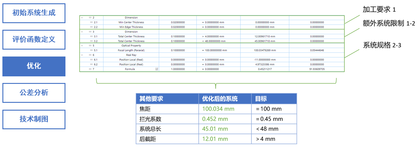 根据系统规格、额外系统限制以及像质与加工要求,定义了各种与之对应的评价函数。