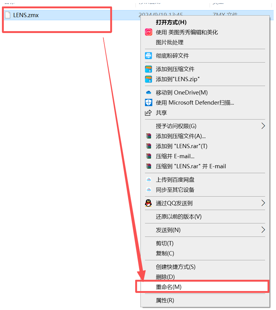 1. 右键单击ZEMAX软件中生成保存的透镜文件,重命名改文件后缀,将“.zmx”改为“.txt”;