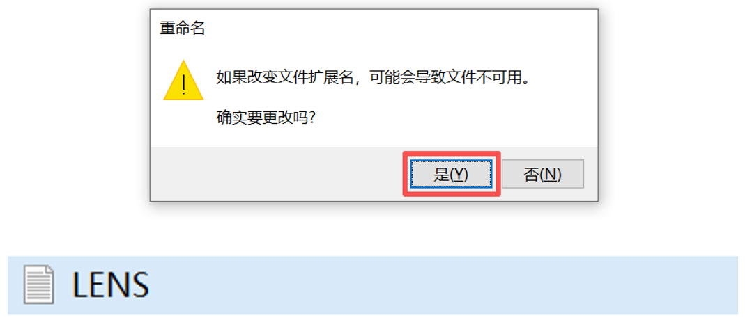 2. 更改完成后,会弹出重命名提醒,点击“是”,文件变为txt格式;