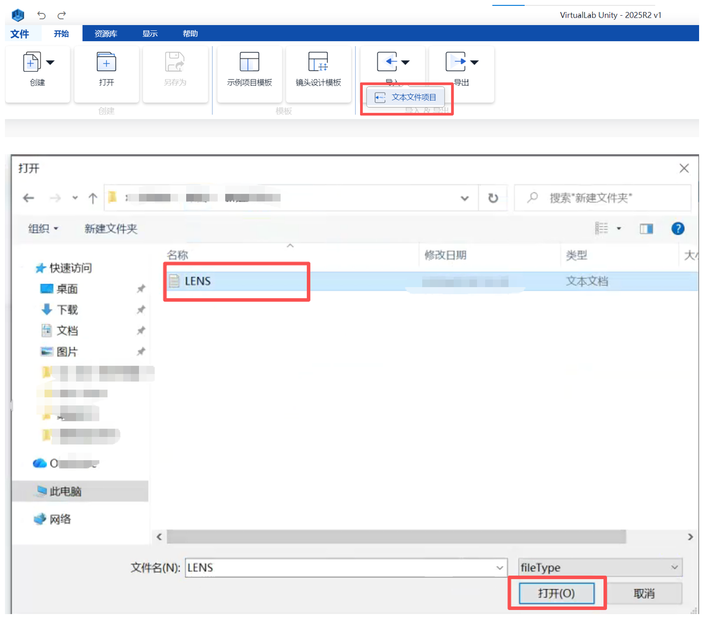 3. 在VirtualLab Unity软件中,点击功能区的“导入”选项卡,弹出对话框,选中当前文本格式的透镜文件,点击“打开”,即可导入;