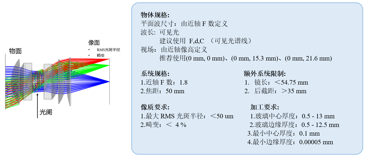 双高斯照相物镜广泛应用于单反相机、工业检测相机、安防监控设备与专业摄影器材中,用于实现大相对孔径成像、宽光谱色差校正以及优异的离轴像质还原。其具有对称光学结构、低畸变率、高分辨率表现的优点,适合应用于对成像清晰度与色彩真实性要求较高的各类摄影光学系统。在本案例中,将在 VLU 中演示双高斯照相机物镜的设计过程,包括初始系统生成、评价函数定义、优化以及结果展示。