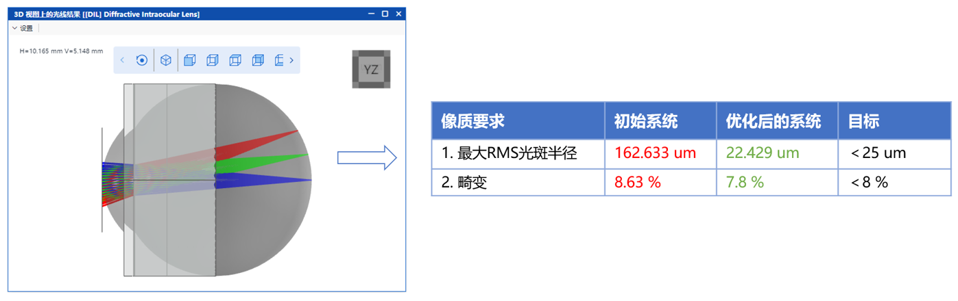 衍射式人工晶状体在现代眼科光学与视觉矫正领域中得到了广泛应用。凭借其衍射光学结构与多焦点设计,该类人工晶状体能够在单一镜片中实现多焦成像,从而在远、中、近不同视距下提供清晰视觉。衍射设计具备优异的色差补偿能力与高光学效率,能够在减少眩光与鬼影的同时提升视觉对比度与成像质量。在本案例中,将通过设计一个远视距下的衍射式人工晶状体,演示在 VLU 中的光学设计流程,包括初始结构生成、像质分析、评价函数定义,优化结果展示以及导出至VLF。