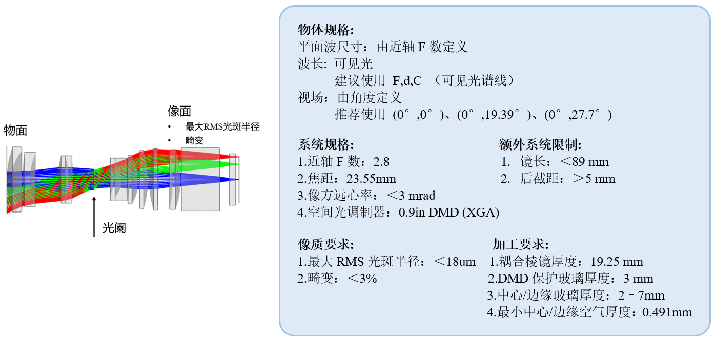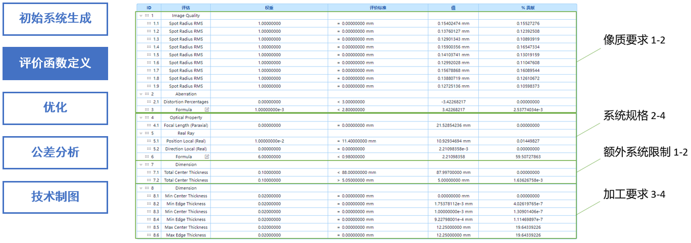根据系统规格、额外系统限制以及像质与加工要求,定义了各种与之对应的评价函数。