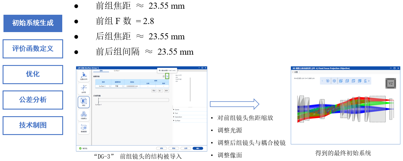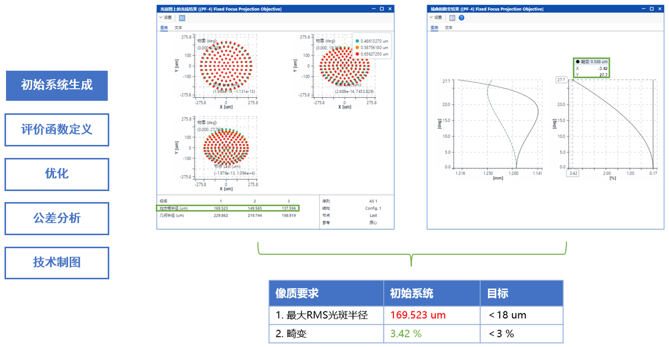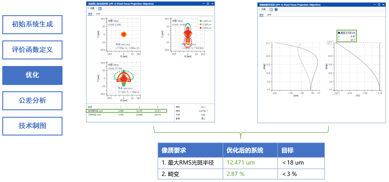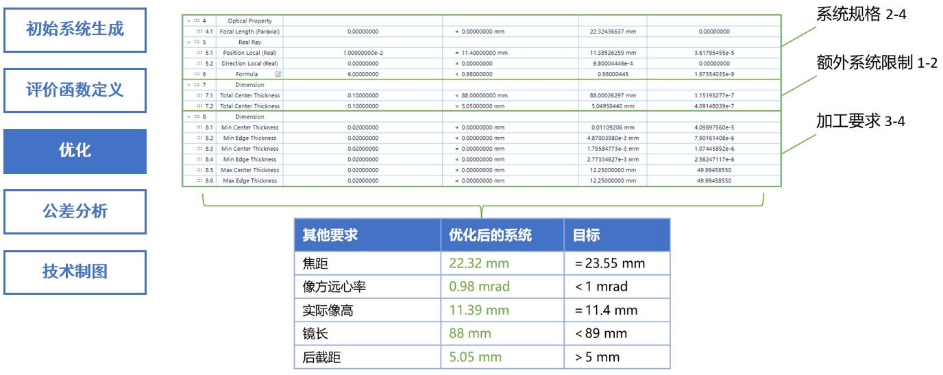 通过采用PSD算法进行优化后,满足了像质要求 1-2、系统规格 2-4、额外系统限制1-2以及加工要求 3-4。