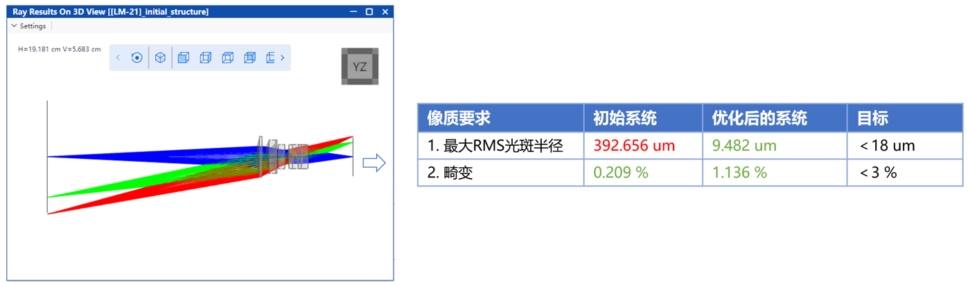 通过采用LM算法进行优化后,满足了像质要求 1-2、系统规格 2、额外系统限制1-3以及加工要求 1-2。