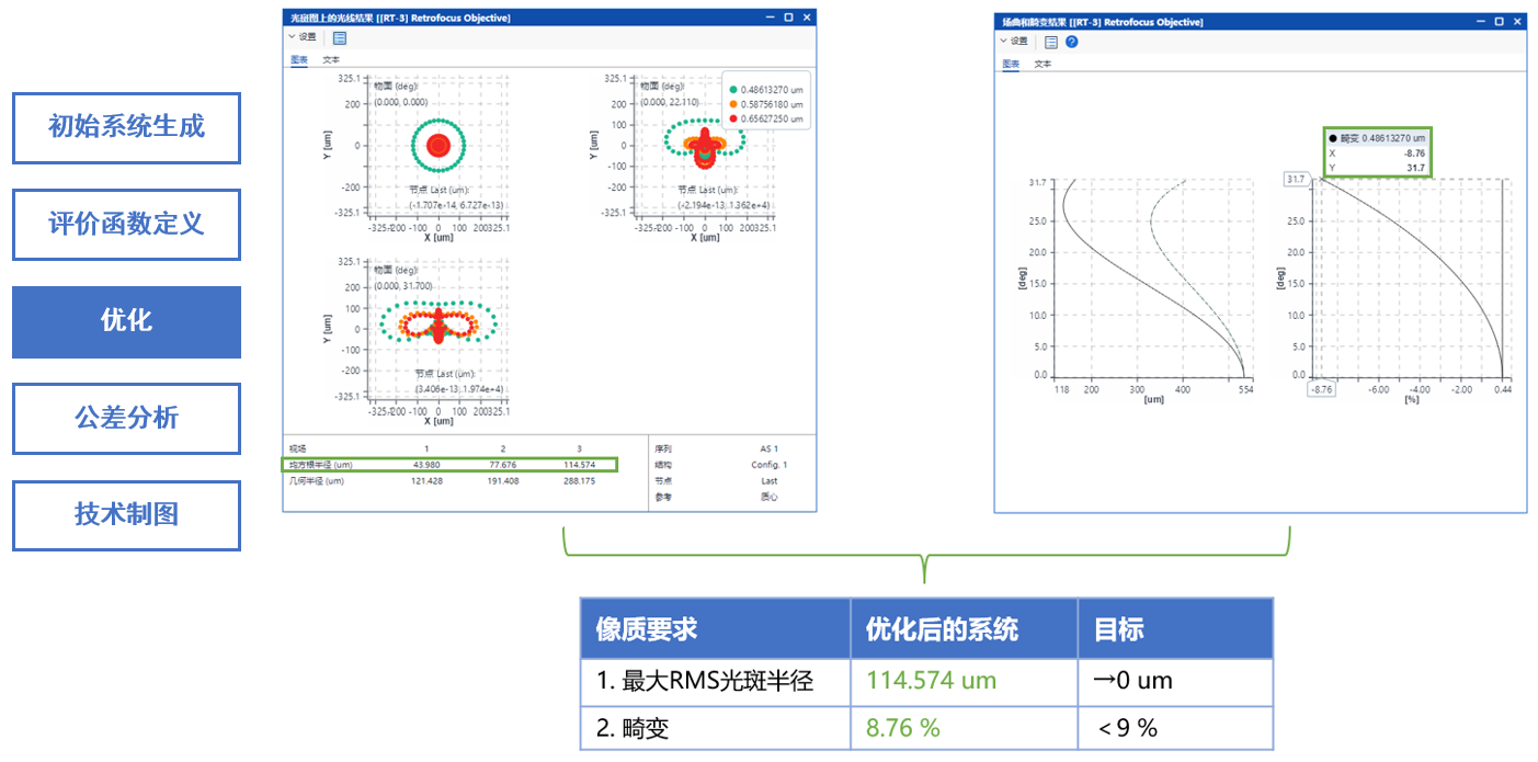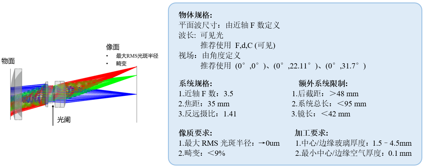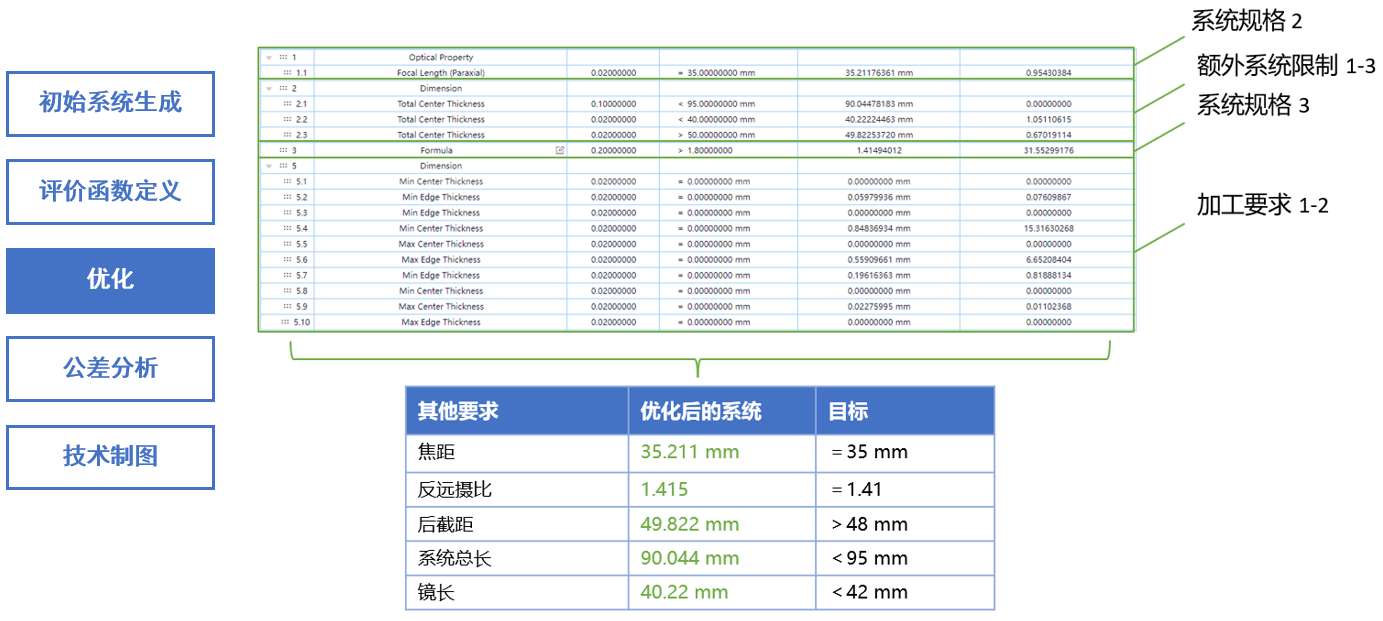 根据系统规格、额外系统限制以及像质与加工要求,定义了各种与之对应的评价函数。