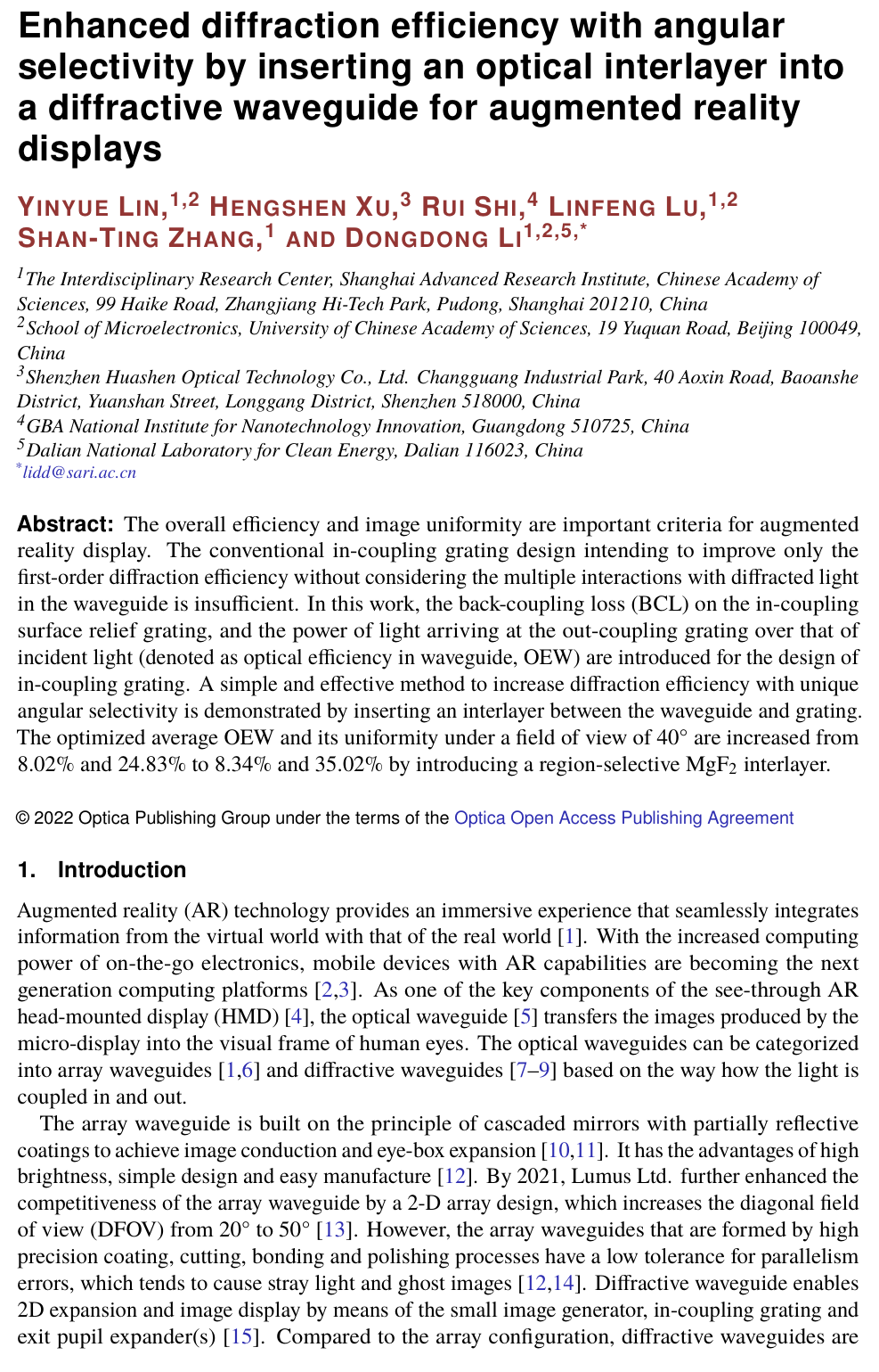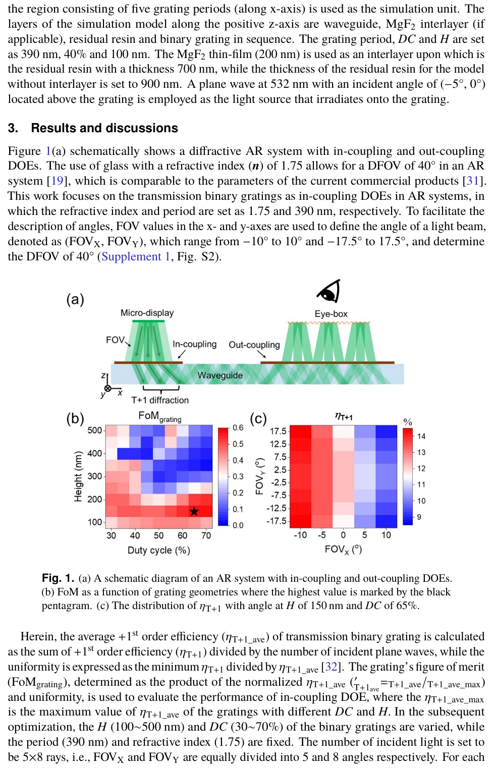 摘要:整体效率和图像均匀性是增强现实显示的重要评判标准。传统的入射耦合光栅设计仅致力于提高一阶衍射效率,却未考虑光波导中衍射光的多次相互作用,因此存在不足。本研究中,为优化耦合光栅设计,引入了入射耦合表面浮雕光栅的背耦合损耗(BCL),以及到达出射耦合光栅的光功率与入射光功率的比值(定义为波导光效率,OEW)。通过在波导与光栅之间插入中间层,我们展示了一种兼具独特角度选择性与高衍射效率的简单有效的方案。引入区域选择性氟化镁(MgF₂)中间层后,在 40° 视场角下,优化后的平均波导光效率从 8.02% 提升至 8.34%,其均匀性从 24.83% 提升至 35.02%。