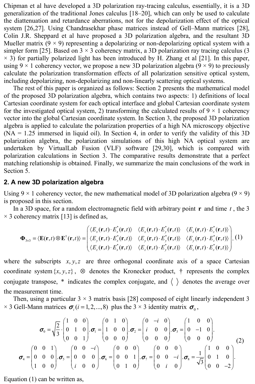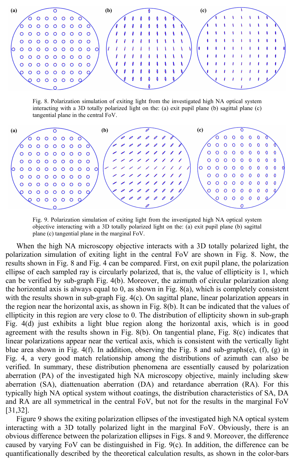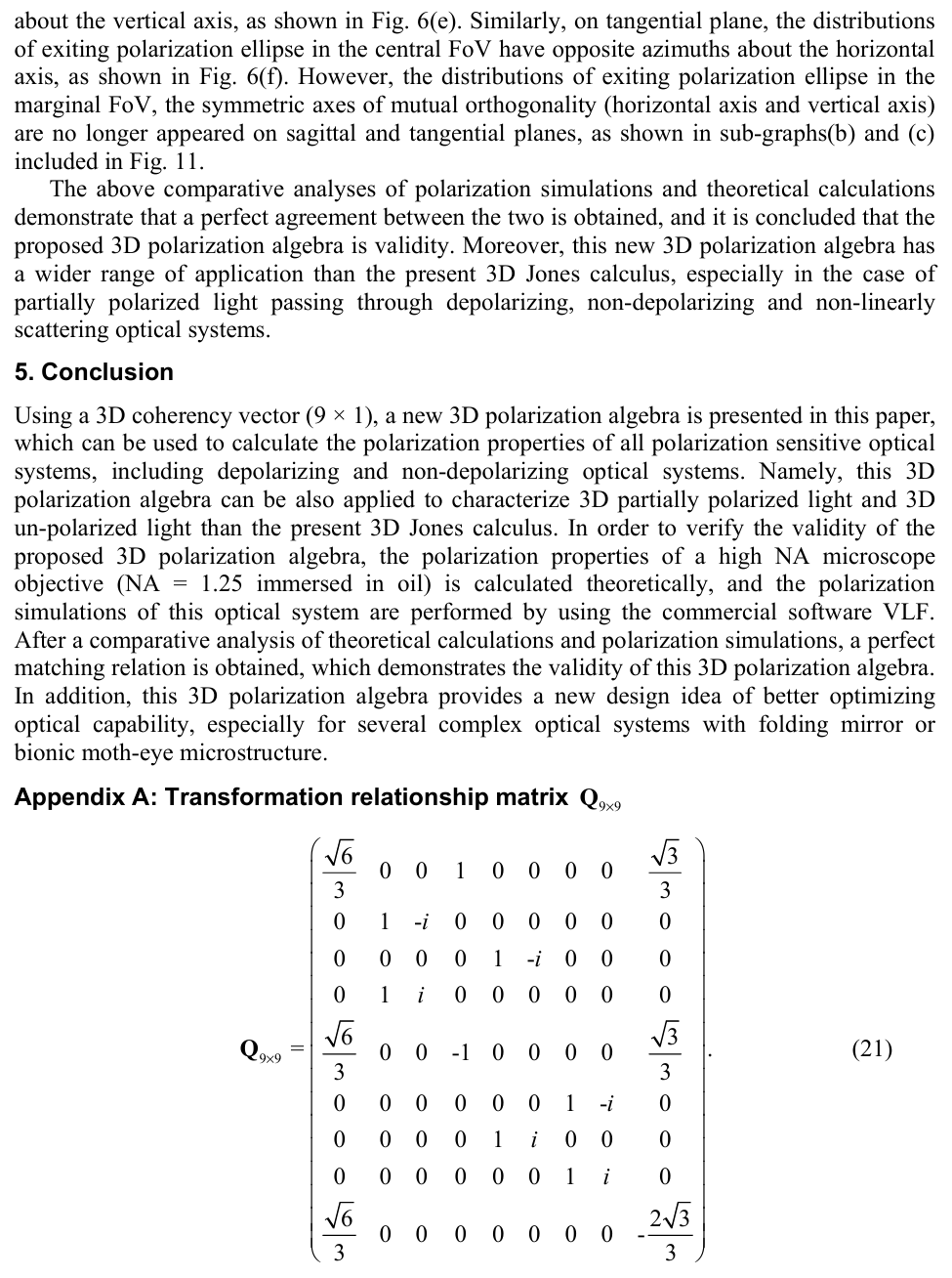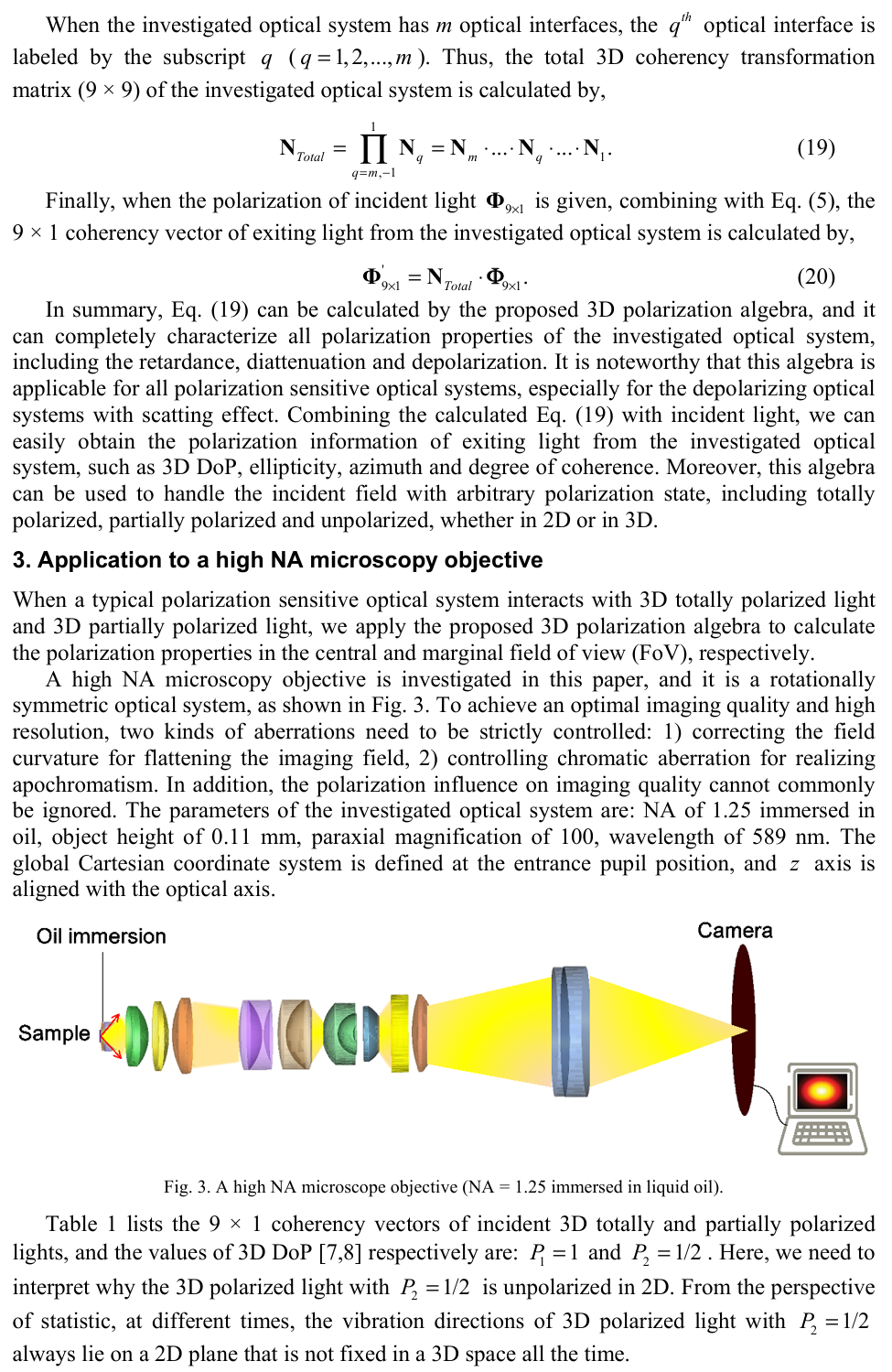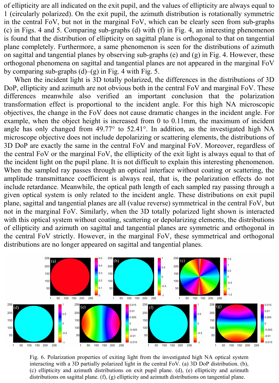 摘要:本文利用三维相干矢量(9×1矩阵)构建了一种新型三维偏振代数,可用于计算所有偏振敏感光学系统的偏振特性,尤其适用于入射光场为部分偏振或非偏振的情况。基于该三维偏振代数,我们对高数值孔径(NA=1.25油浸式)显微物镜的偏振特性进行了理论分析,并采用商用软件VirtualLab Fusion对该高数值孔径光学系统进行了偏振仿真。通过对比理论计算与仿真结果,两者呈现出完全匹配的关系,证实该三维偏振代数能够有效量化所有偏振敏感光学系统的三维偏振特性。