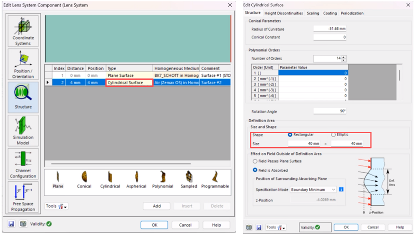 如图2所示,根据柱面镜表面的类型可以将它分为平凹柱面镜、平凸柱面镜和双凸柱面镜。单个平凸柱透镜由一个矩形平面和一个圆柱面构成,前表面分别称为母线和弧线,根据焦距公式R=f(n-1), f为镜头焦距,n为折射率,R为曲率半径,矢高公式为  ,W为半弧线宽。这里设置宽度和长度都为20mm,材料为BK7,焦距为100mm,对应的曲率半径为51.68 mm。可以利用常用的软件生成镜头文件,也可以用VirtualLab Fusion中的Lens Sytem表面编辑的功能进行编辑。