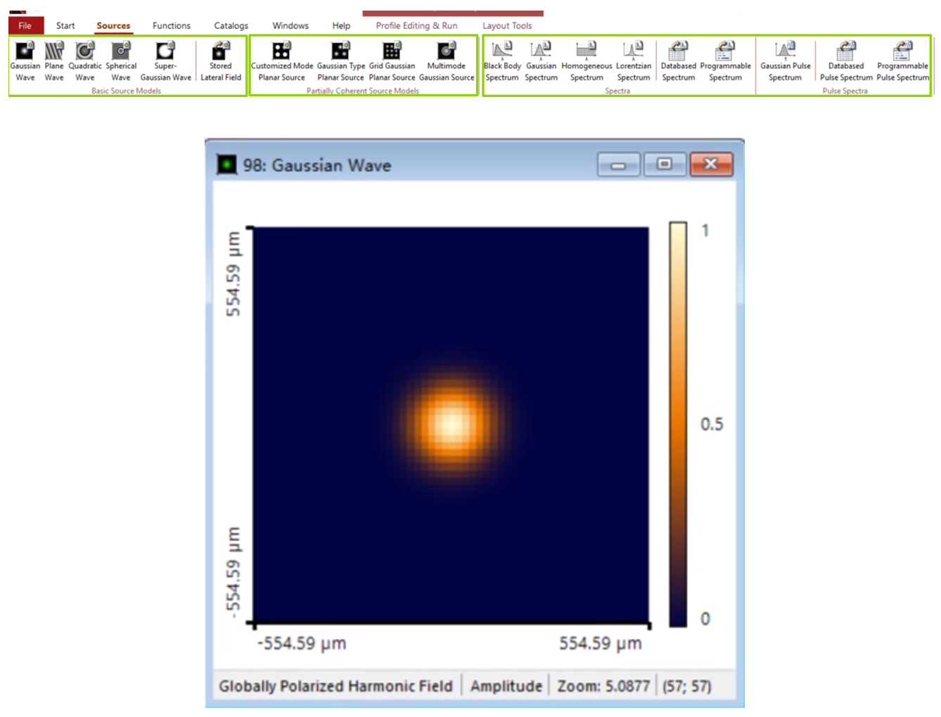 在顶部的功能区菜单中选择Sources,可以看到VirtualLab Fusion提供了基础光源(包含高斯光束、平面波、像散波、球面波、超高斯波和存储光场)、部分相干光源、光谱以及脉冲。