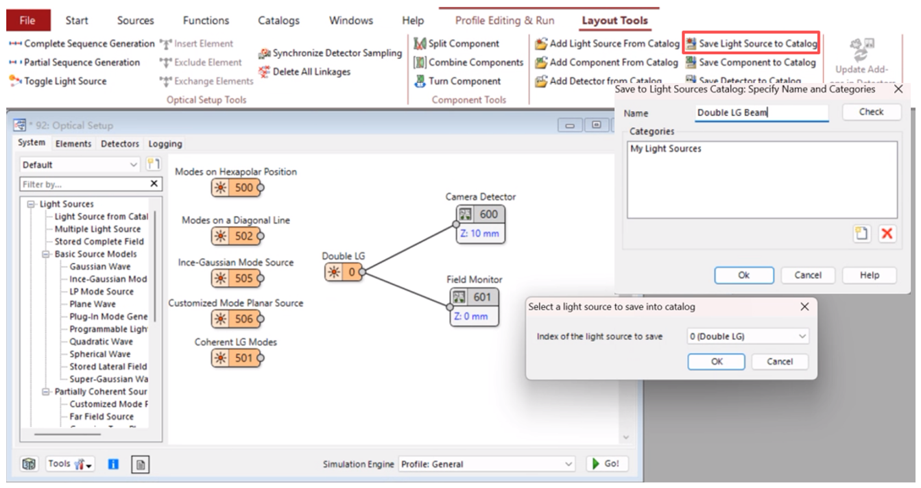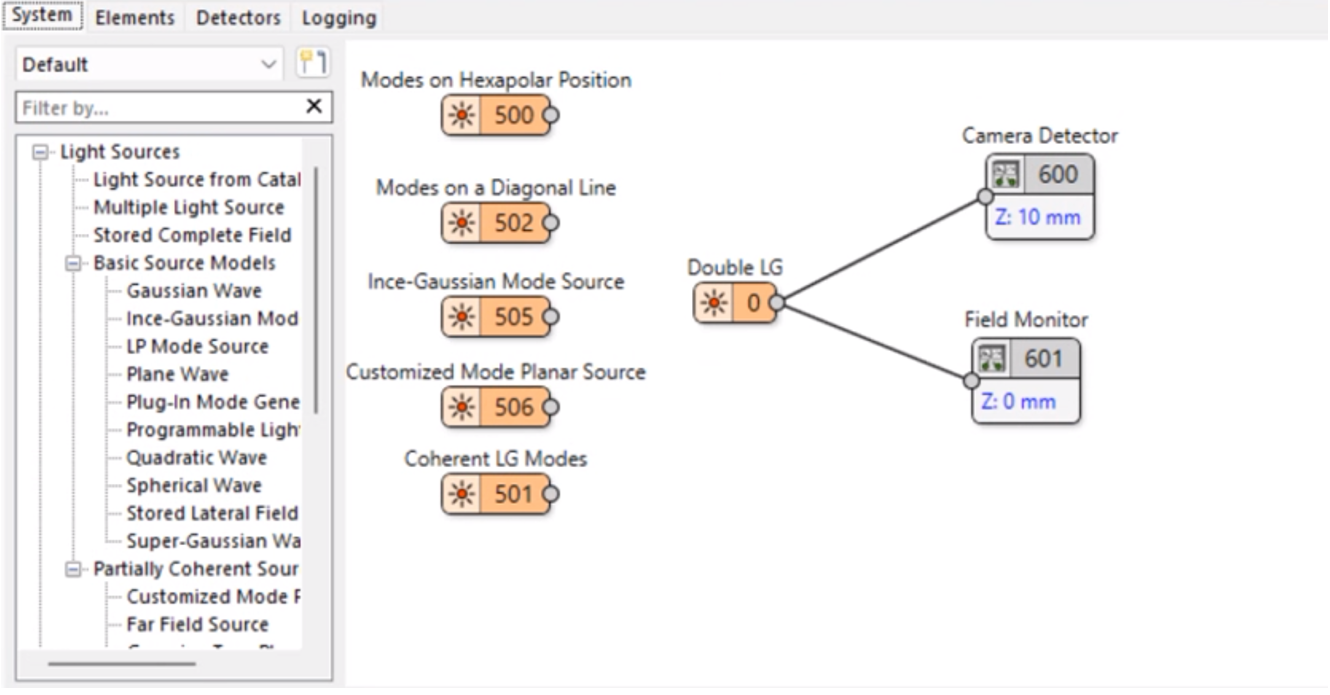 在光路编辑器当中也可以直接添加光源。包括基础的激光光源(厄米高斯光束、拉盖尔高斯光束、因斯高斯光束)等。