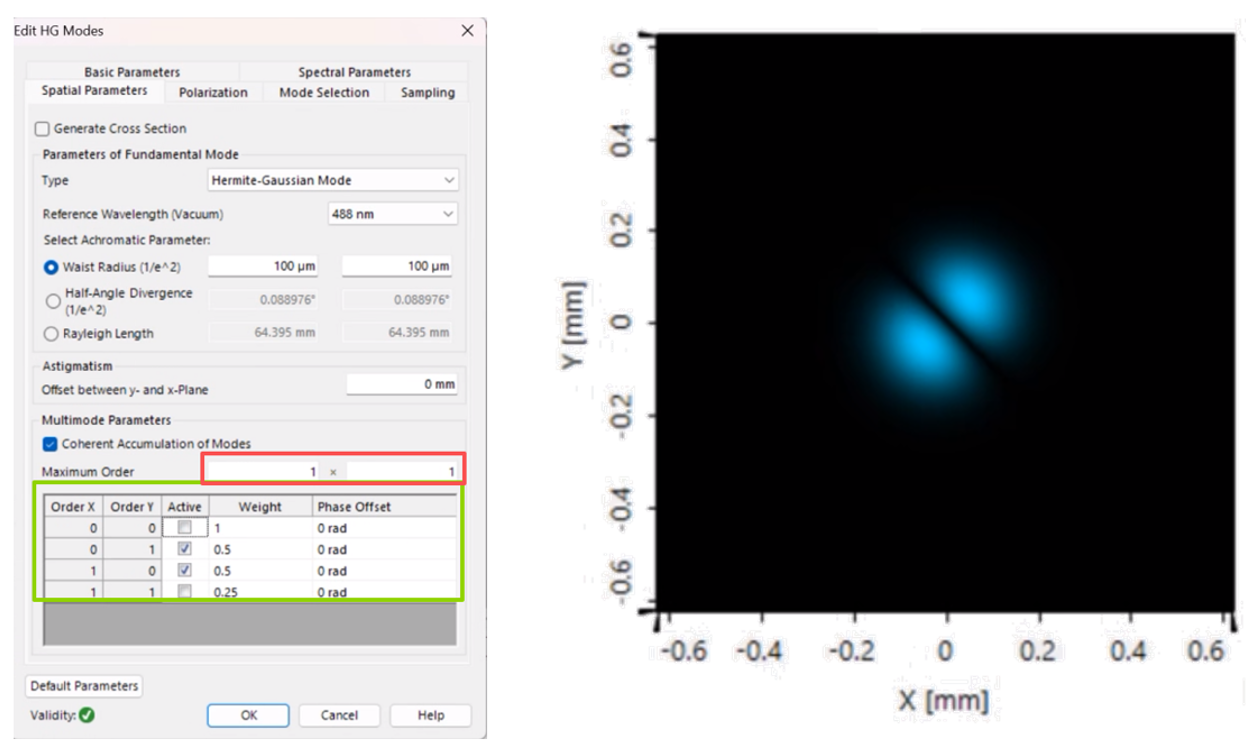 在叠加厄米高斯光束中可以设置多个厄米高斯模式的相干叠加,在绿色框中输入x和y方向的最大阶数,在下方可以勾选对应叠加的模式、设置权重和相位差(Phase Offset)