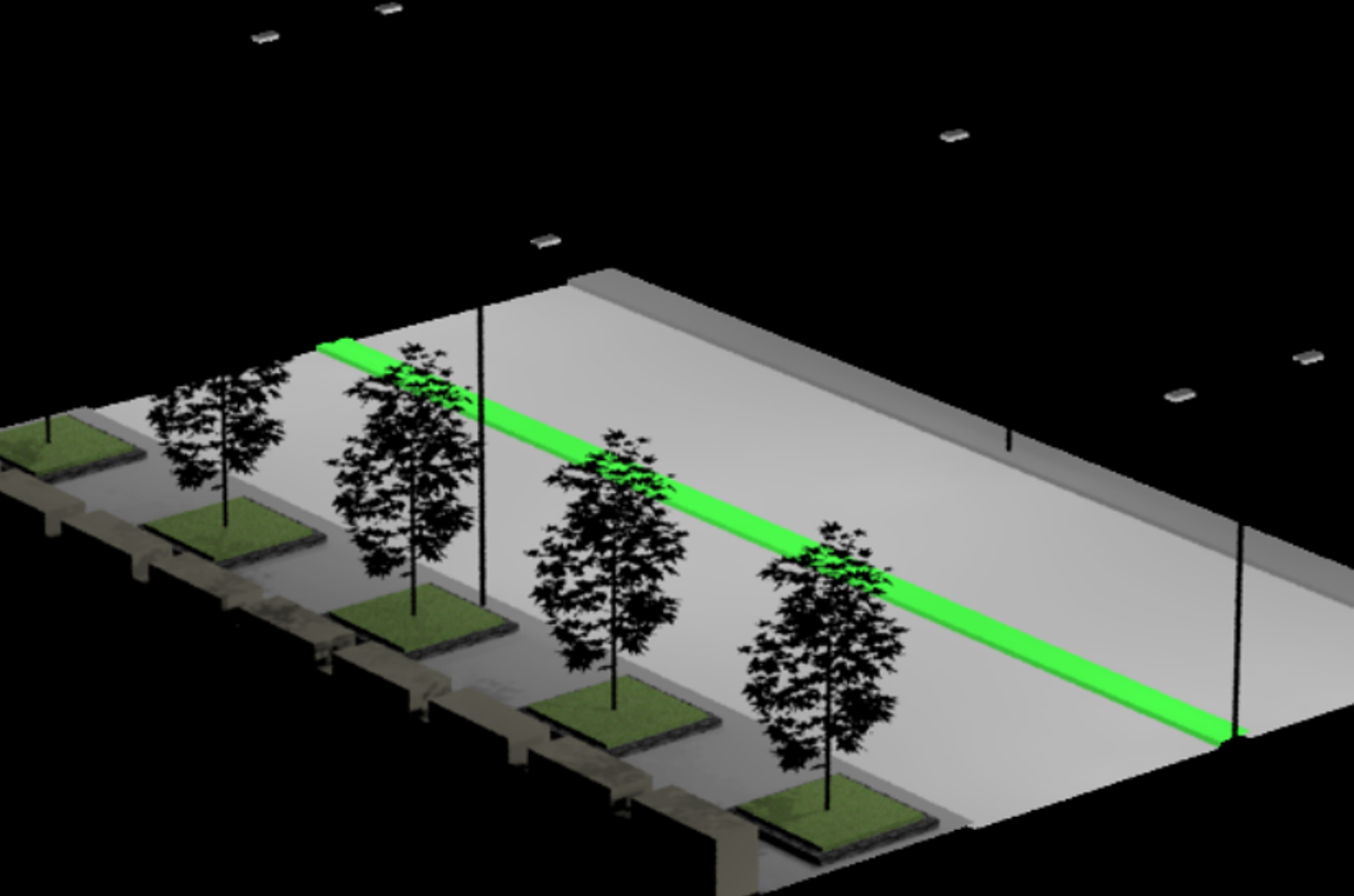 设计道路面积合理,其中布置灯具,交通工具摆放合理,符合照明标准。