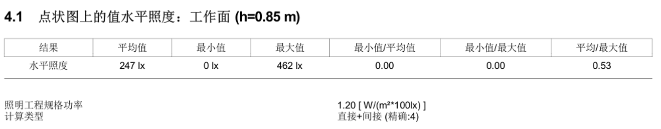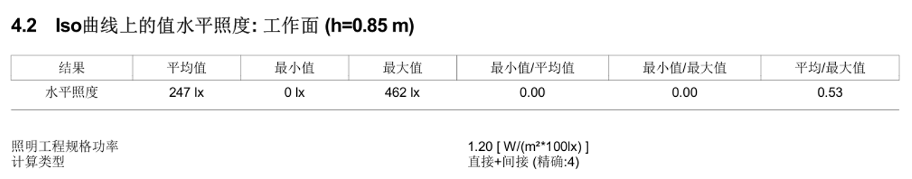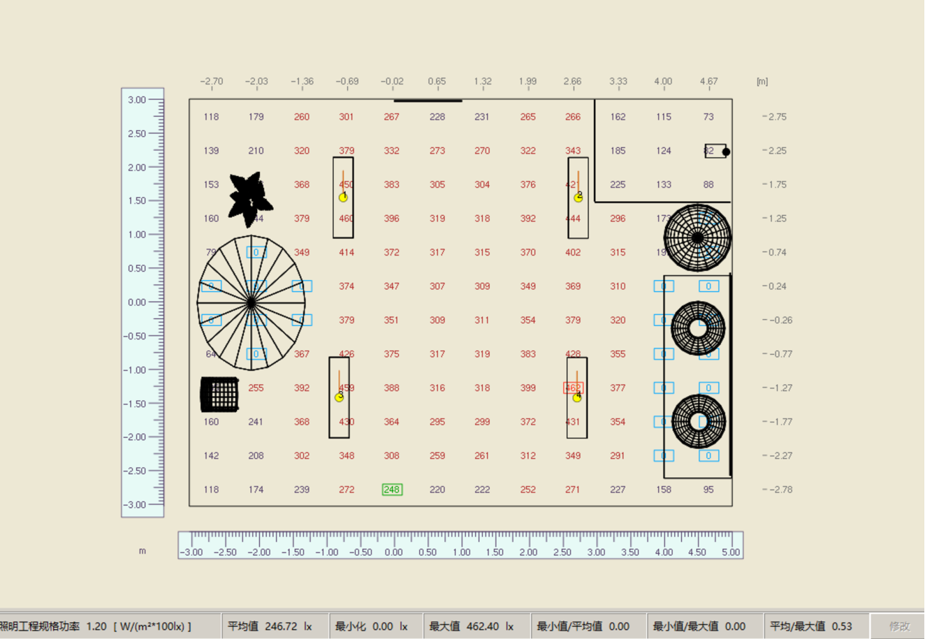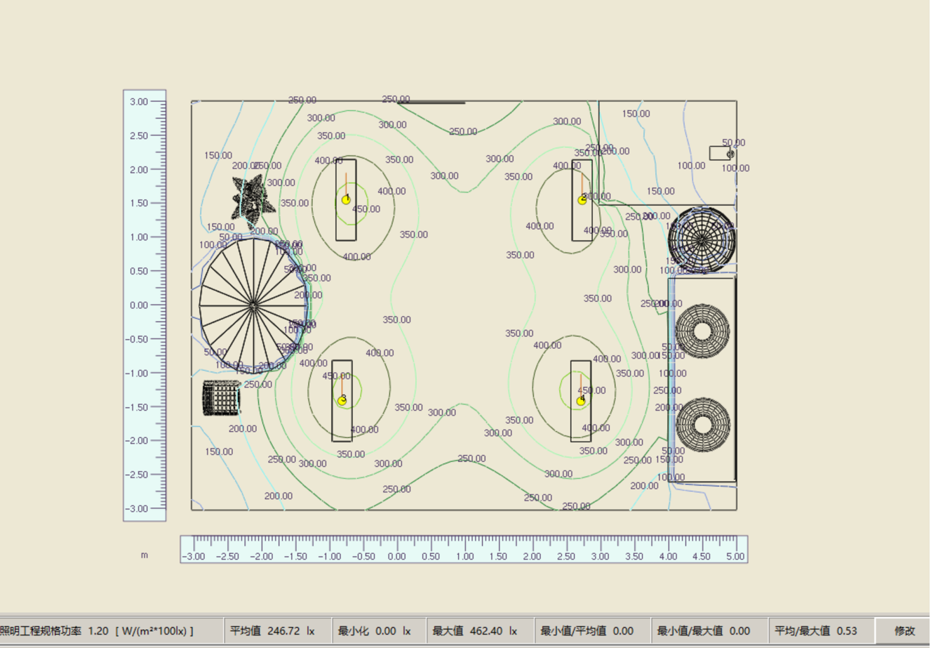 数值图显示区域照度为250-450lx。