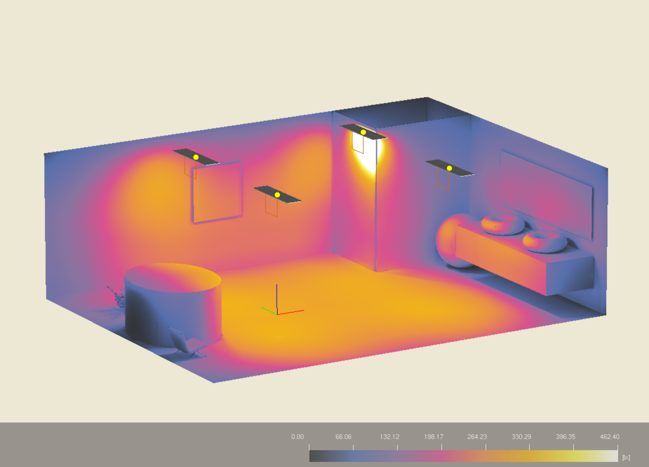 伪色彩图显示灯具所照射范围基本为暖黄色到淡紫色,颜色过渡平缓,照度分布较为均匀