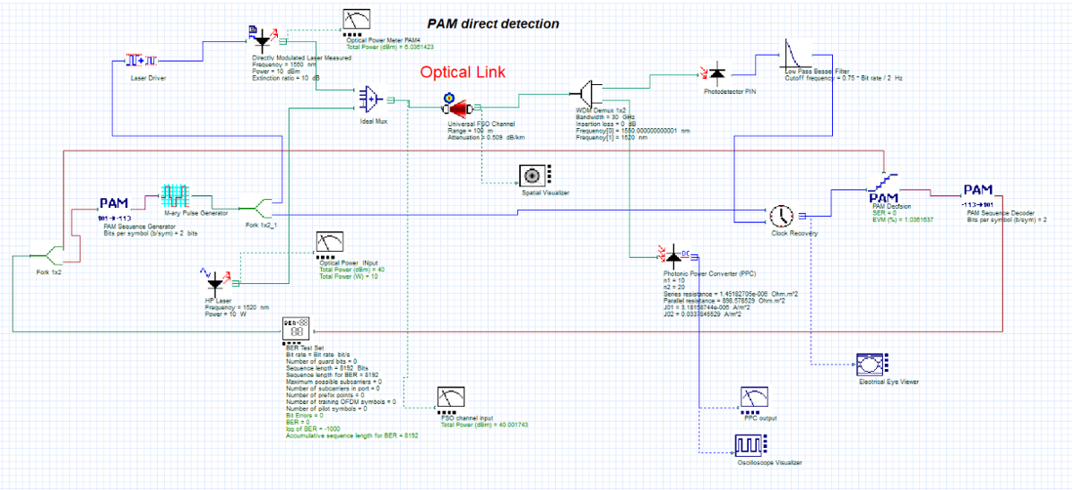 在案例中,我们演示了在OptiSystem中仿真PAM4 FSO系统。系统中我们使用FSO信道,考虑了在大气湍流中的光强闪烁,然后可通过导入数据来定义大气湍流的相位。