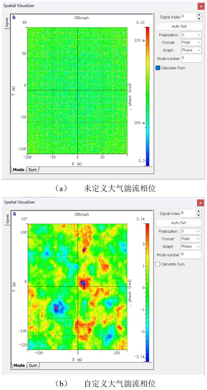 下面我们对比一下导入前后的大气湍流相位。如图4(a)为未定义大气湍流相位,图4(b)为自定义大气湍流相位。