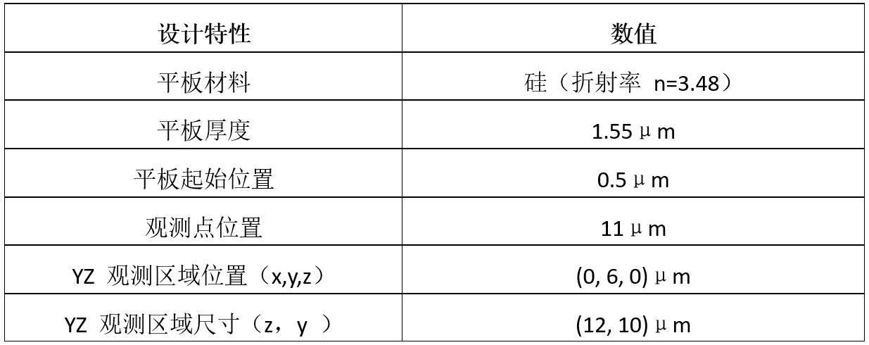 第一种设计为介质(硅)平板。该示例将展示无场聚焦的情况,并作为两种透镜设计的参考基准。该平板也是后续两种设计的基础,后两种设计均通过在平板上蚀刻制成。