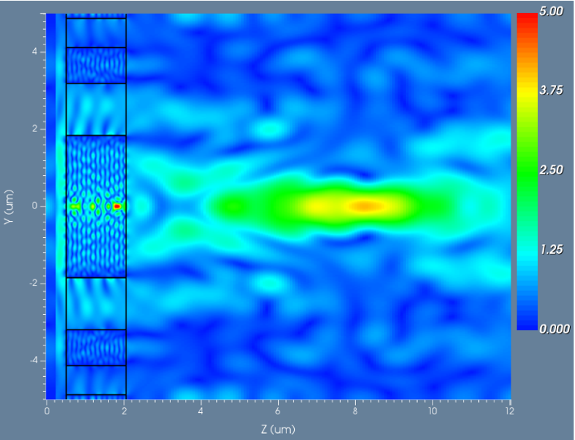 将透镜设计改为超透镜后,得到了相似的结果。其焦点峰值位于 8.0475μm 处,但光斑尺寸更大。两种设计结果的差异源于超构透镜中高透过率区的折射率对比度不同且透射率较低。