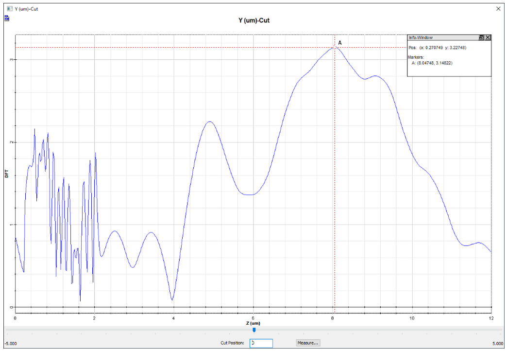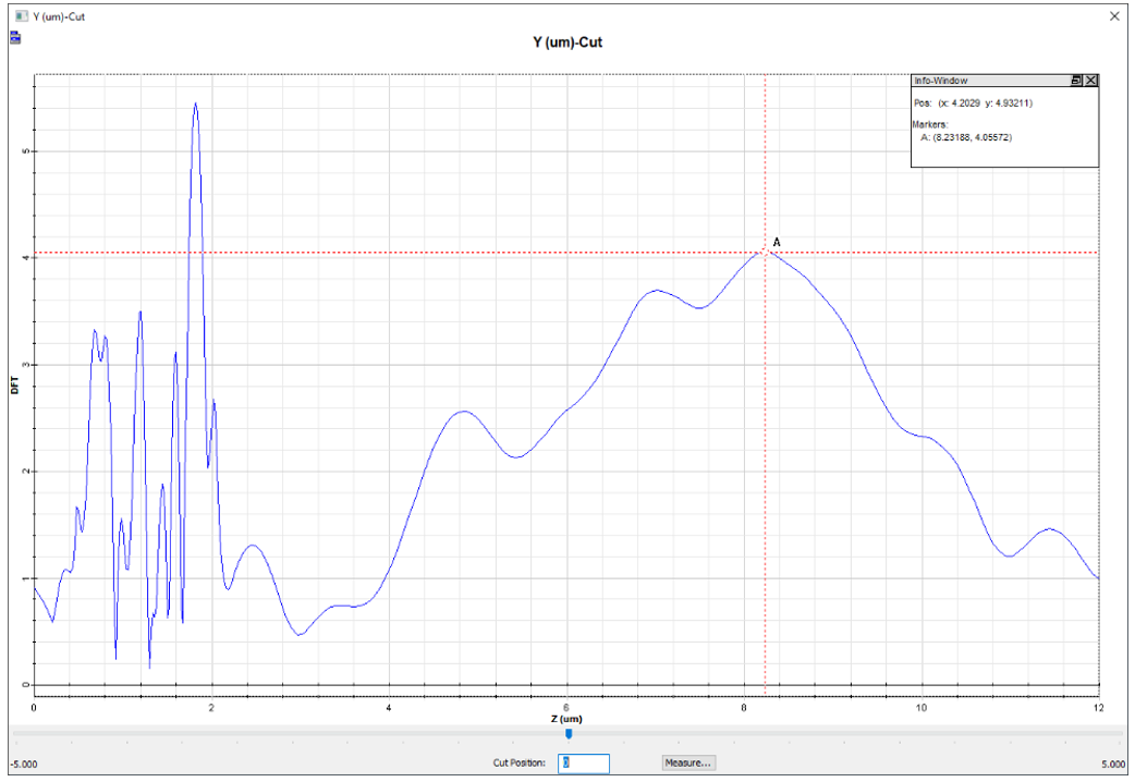 采用菲涅耳透镜设计后,光线实现了场聚焦(如图 5 所示)。沿 z 轴切片(如图 6 所示)显示,焦点峰值位于 8.2319μm 处。