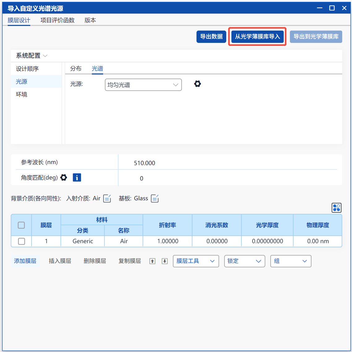 1、点击“从光学薄膜库导入”,就可以从薄膜库中导入所需薄膜。