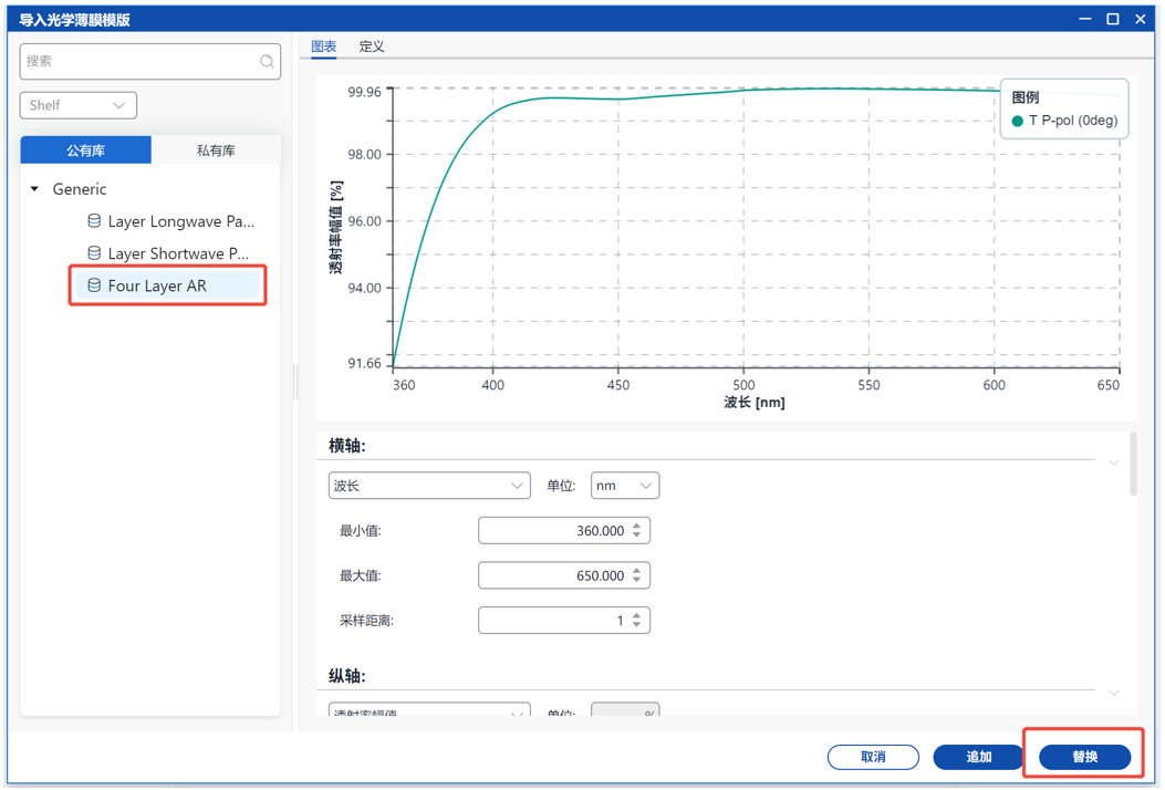 2、在薄膜库中,选择“Four Layer AR”,再点击替换就可将选中的四层AR膜导入到项目中。