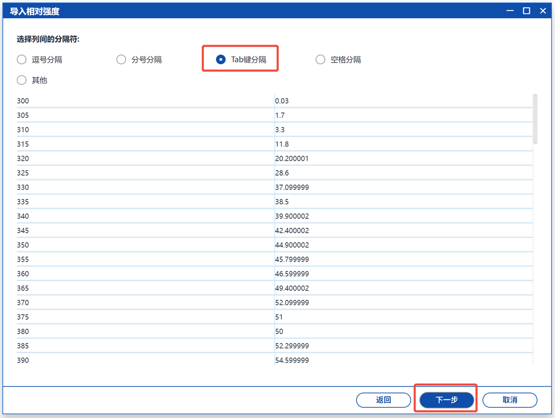 2、在导入光谱数据文件后,将Rel Output这一行排除,并点击下一步。