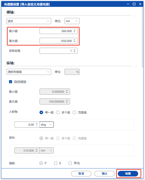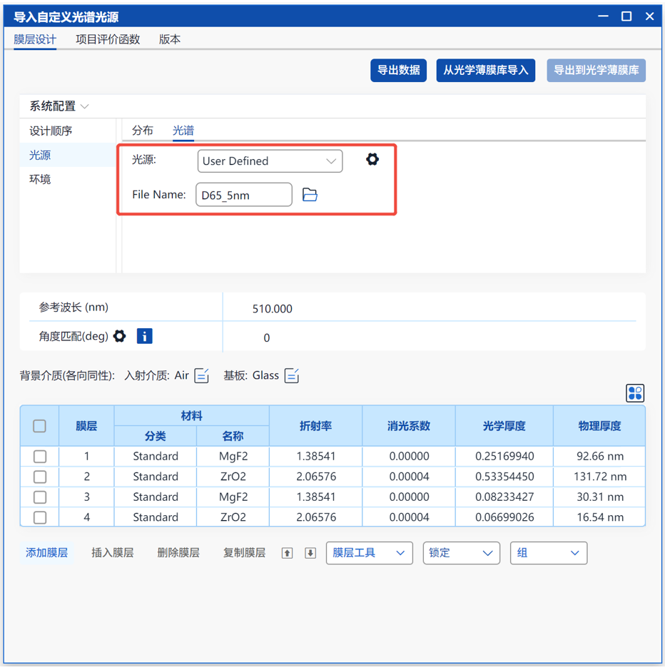 1、在膜层设计的系统配置下,将光源设置为通过导入光谱数据来自定义光源,可在上图所示位置加载光谱数据。