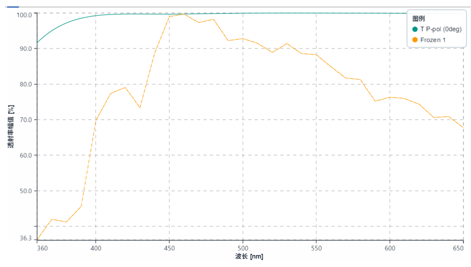 照明光谱对透过率曲线的影响,绿色线为均匀光谱,黄色线为自定义光谱