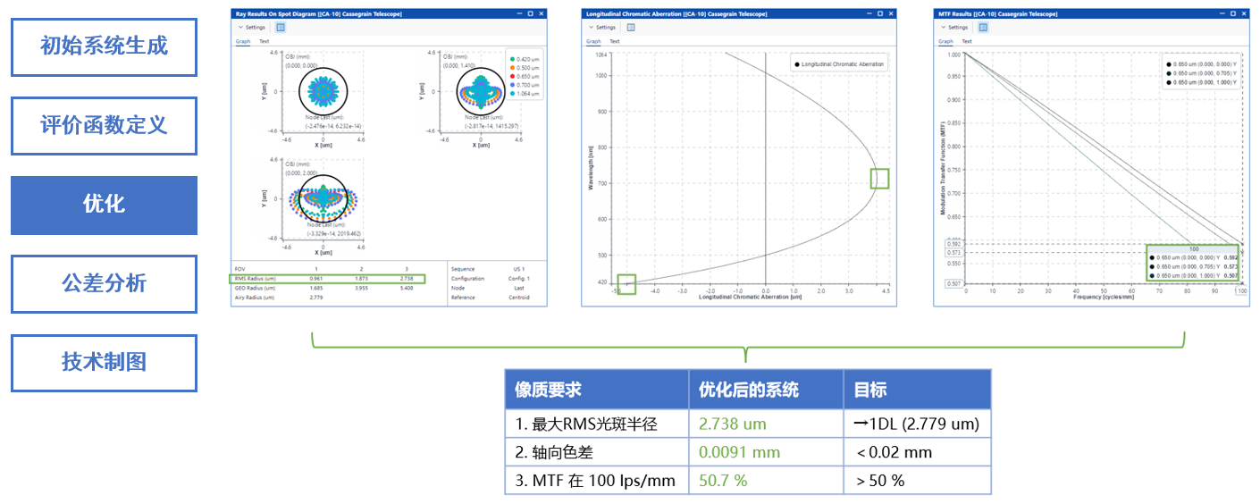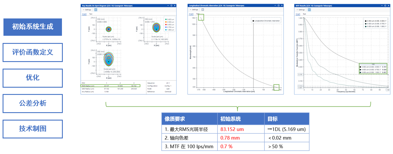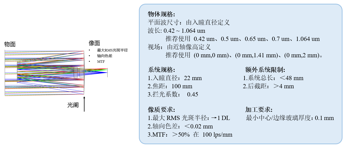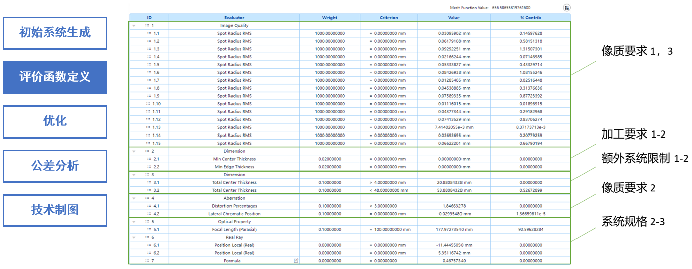根据系统规格、额外系统限制以及像质与加工要求,定义了各种与之对应的评价函数。