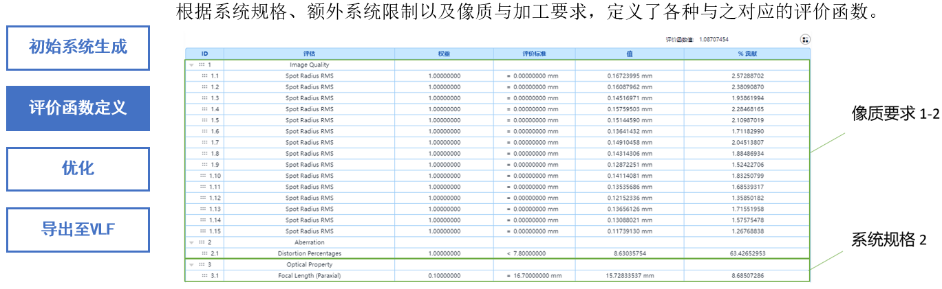 根据系统规格、额外系统限制以及像质与加工要求,定义了各种与之对应的评价函数。