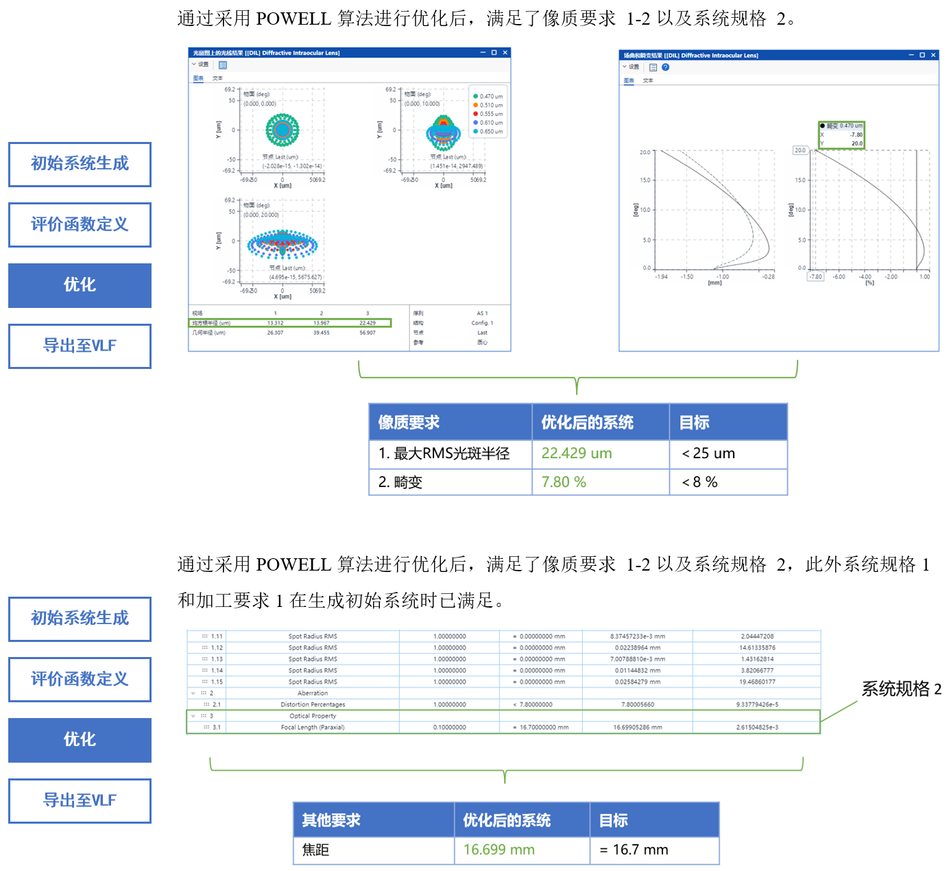 设计结果如下,像质,系统规格、额外系统限制以及加工要求均满足预期设计目标。