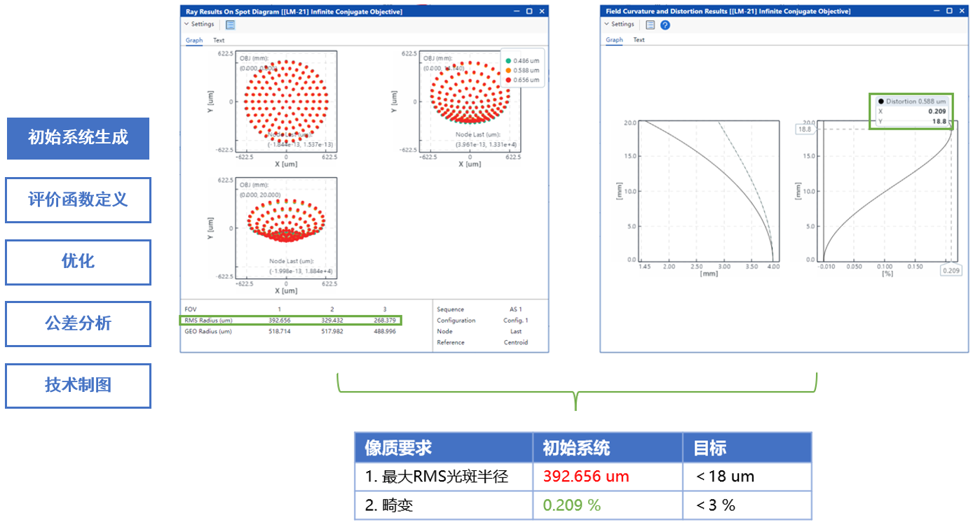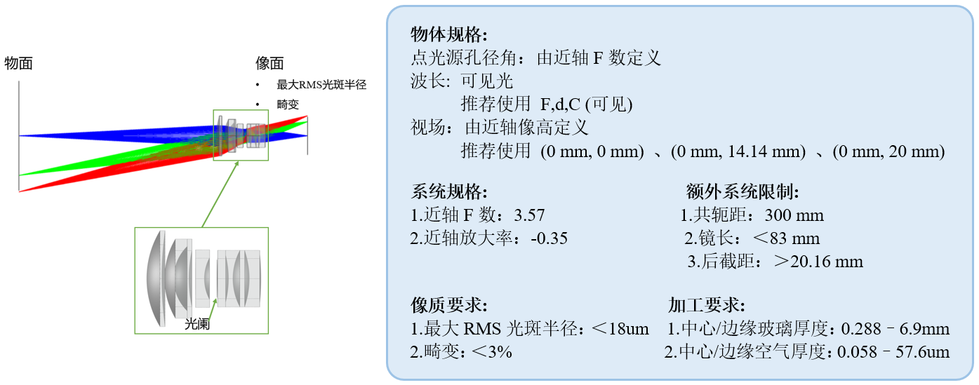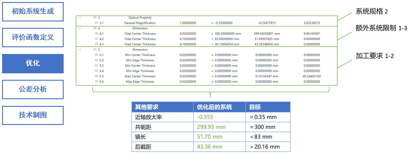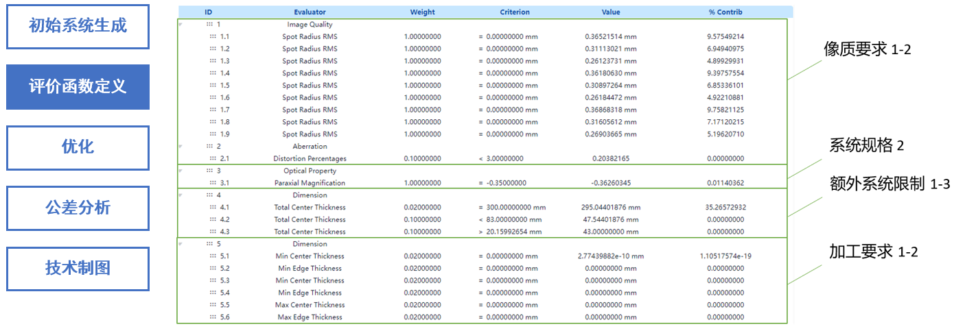 根据系统规格、额外系统限制以及像质与加工要求,定义了各种与之对应的评价函数。