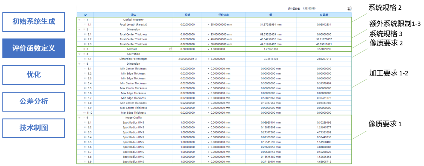 根据系统规格、额外系统限制以及像质与加工要求,定义了各种与之对应的评价函数。