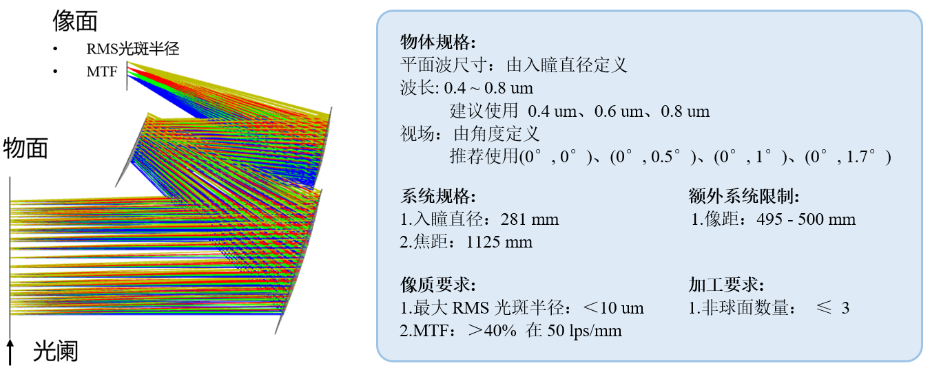 离轴三反系统广泛应用于航天遥感、天文观测、高端光谱仪及高分辨率成像设备中,用于实现大视场范围内的高清成像、消除中心遮挡影响以及满足宽光谱成像需求。其具有性能卓越(通常由三片反射镜组成)、成像对比度高、光谱适应性强的优点,适合应用于对成像分辨率和环境适应性要求严苛的高端光学系统。在本案例中,将在 VLU 中演示离轴三反系统的设计过程,包括初始系统生成、评价函数定义、优化以及结果展示。