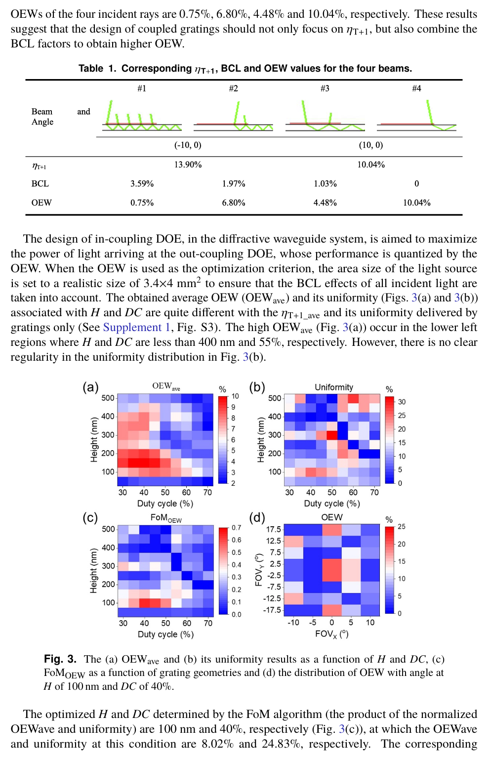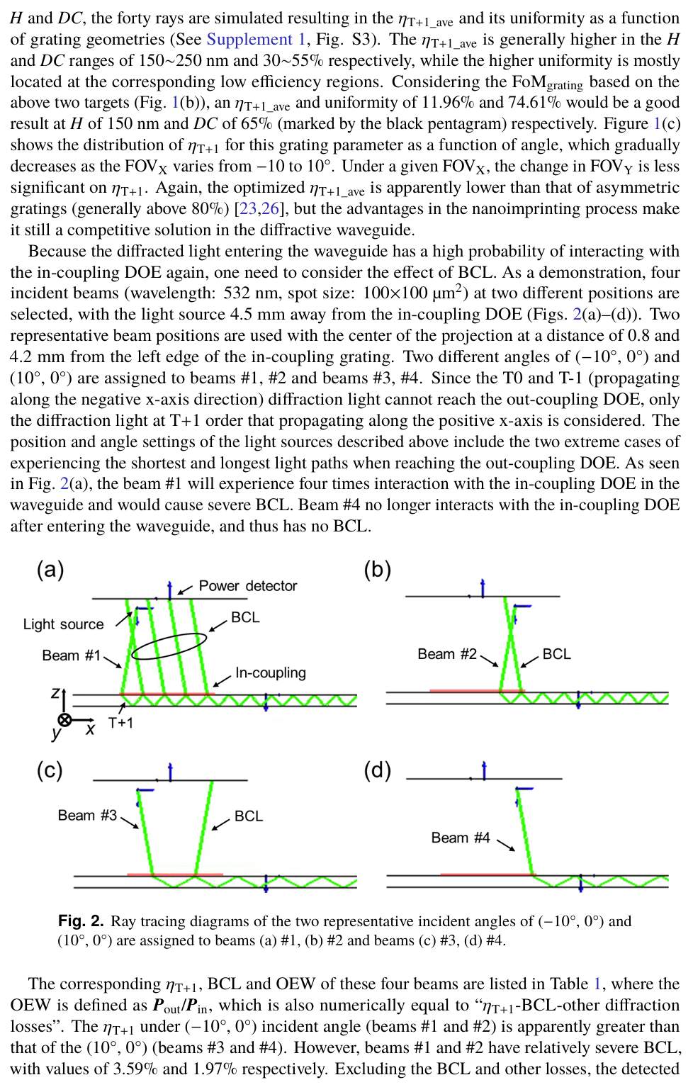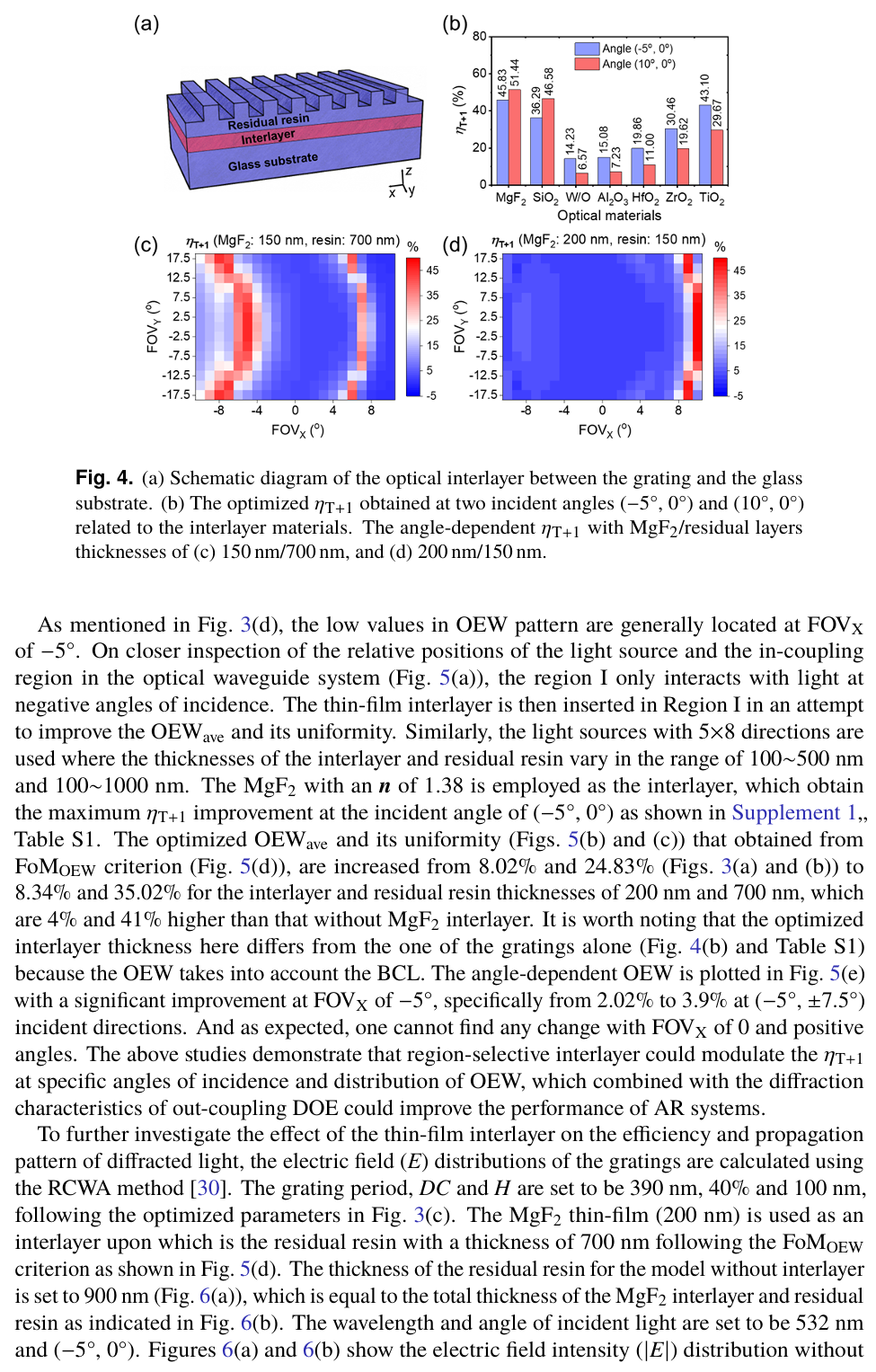 摘要:整体效率和图像均匀性是增强现实显示的重要评判标准。传统的入射耦合光栅设计仅致力于提高一阶衍射效率,却未考虑光波导中衍射光的多次相互作用,因此存在不足。本研究中,为优化耦合光栅设计,引入了入射耦合表面浮雕光栅的背耦合损耗(BCL),以及到达出射耦合光栅的光功率与入射光功率的比值(定义为波导光效率,OEW)。通过在波导与光栅之间插入中间层,我们展示了一种兼具独特角度选择性与高衍射效率的简单有效的方案。引入区域选择性氟化镁(MgF₂)中间层后,在 40° 视场角下,优化后的平均波导光效率从 8.02% 提升至 8.34%,其均匀性从 24.83% 提升至 35.02%。